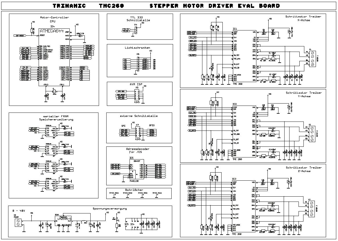 Ja, genau ich habe die eine Platine und das Fehlen der TMC Parameter Änderung bemerkt :-)) Der Aufbau war ohne Probleme möglich (wenn man SMD Löten kann). Die Null Ohm Widerstände R8, R9, R17, R18, R26 und R27 dürfen nicht bestückt werden. (Danke Steffen für den Hinweis.) Die Teile habe ich zum größten Teil bei Reichelt gekauft, nur den Spannungsregler (IC10), die 0,15 Ohm Shunts (R1, R2, R10, R11, R19, R20) und die TMC260 habe ich bei Schuricht / Distrelec gekauft, da Reichelt sie nicht hat. Eine vollständige Bestellung bei Distrelec wäre teurer gewesen als die extra Versandkosten. Für meine Schrittmotoren musste ich die Parameter der TMC's ändern. Es gibt auf der Trinamic Homepage ein kleines Programm mit dem man die HEX Werte der einzelnen Register bestimmen bzw entschlüsseln kann. So habe ich die von Steffens Software die Werte dort eingegeben und anschließend den Wert für den Stepper Strom erhöht, die neuen Werte dem Programm entnommen und in die Software übernommen. Ich will später die Platine über ein Optokopplerboard an einem LinuxCNC PC betreiben. Dafür bekommt der ATmega eine neue Firmware die "nur noch" die TMC's steuert und über den PC angesprochen werden kann. Der von mir vorgesehene PC zickt derzeit allerdings noch rum :-/ Auch ist das Optokopplerboard noch nicht fertig. Das ganze soll die schrottige Steuerung meiner Elektor "Profiler" CNC Fräse ersetzen. Mal sehen B-)