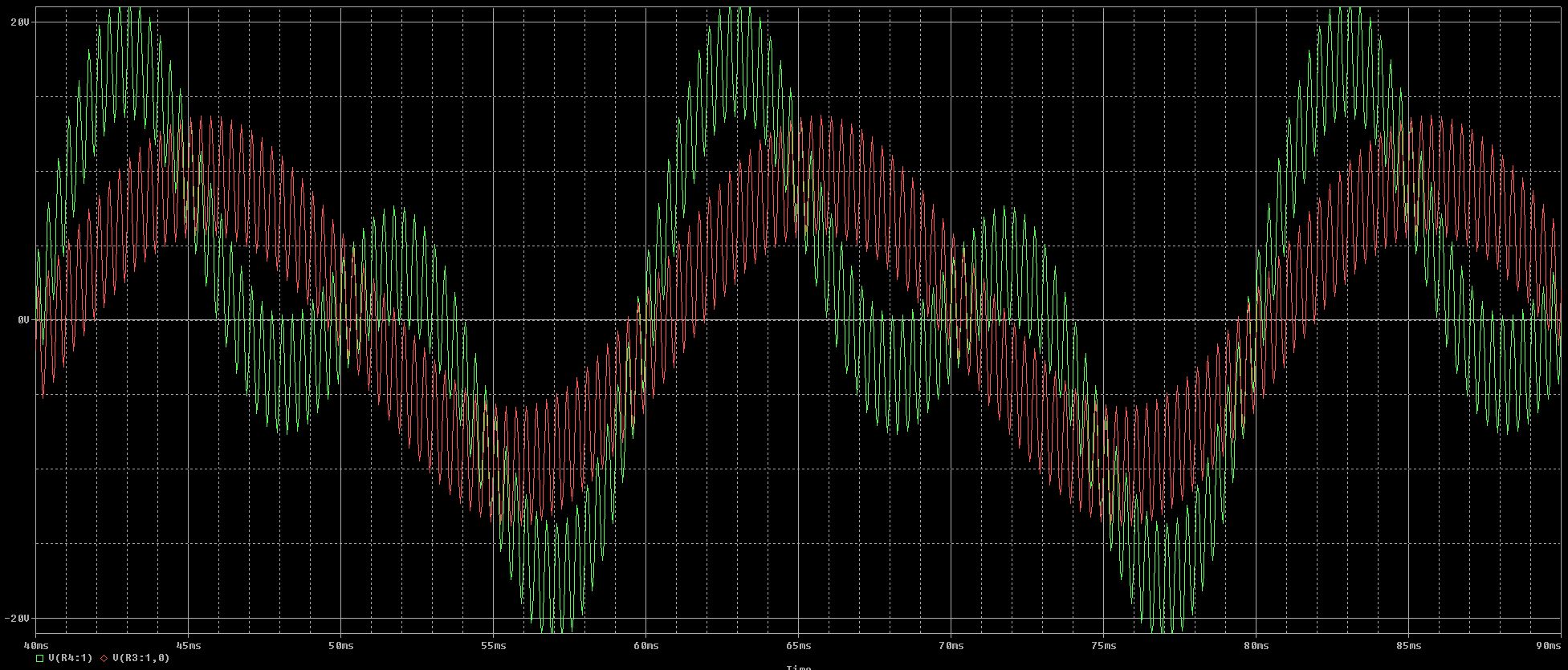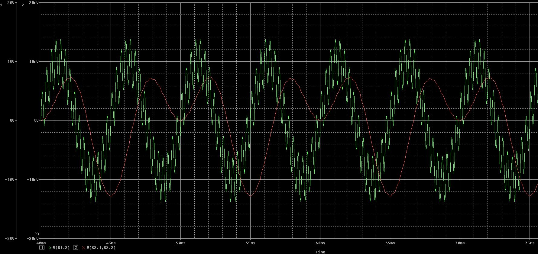 Ich verstehe deine Simulation nicht so richtig. MKF_RSK_Bandpass_schaltung.gif: Du erzeugst eine Spannung mit 200 Hz und 3 kHz, am Ausgang ist ein Reihenschwingkreis mit 100 Hz Resonanzfrequenz und 3 Ohm Innenwiderstand. Was erwartest du denn da zu sehen? Bei 200 Hz und 3 kHz wirkt der Schwingkreis hauptsächlich als Induktivität; der Anteil mit 3 kHz wird stärker bedämpft als bei 200 Hz.