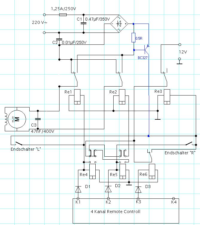 Guten Tag, zu erst das übliche, ich bin neu am Forum, habe Stundenlang Beiträge gelesen und das was ich brauche nicht gefunden. Vielleicht habe ich Übersehen. Habe mir ein Steuerung für Eingangs Tor gebastelt. Es wird Fernbedient. Entfernung zwischen Haus und Tor ca. 50 m. Das Ganze funktioniert vorragend, nun es gibt ein Problem mit der Sicherheit. Vor ein paar Tagen haben Kinder Holzlatten eingeklemmt, gut dass ich das gesehen habe, sonst währe der Motor hin. Jetzt zu Sache, ich suche einen Schaltplan mit Thyristor, Transistor, Tiriac, der den Motor bei m lasten über 1A abschaltet, (Motor Stromlast bei Start 0,95A und beim lauf 0.3A) bzw. den „Re3“ mit 12V Spannung versorgt. Bitte nur ernsthafte Idee, nicht „Conrad oder Reichelt“, ich Wohne in Asien, hier gibt es kein „Conrad“. Mein Steuerschaltung erklärt sich von allein und wenn nicht stehe ich für weitere Fragen Selbstverständlich zu Verfügung. Ich bedanke mich schon mal im Voraus für die Antworten. Grüße Andy