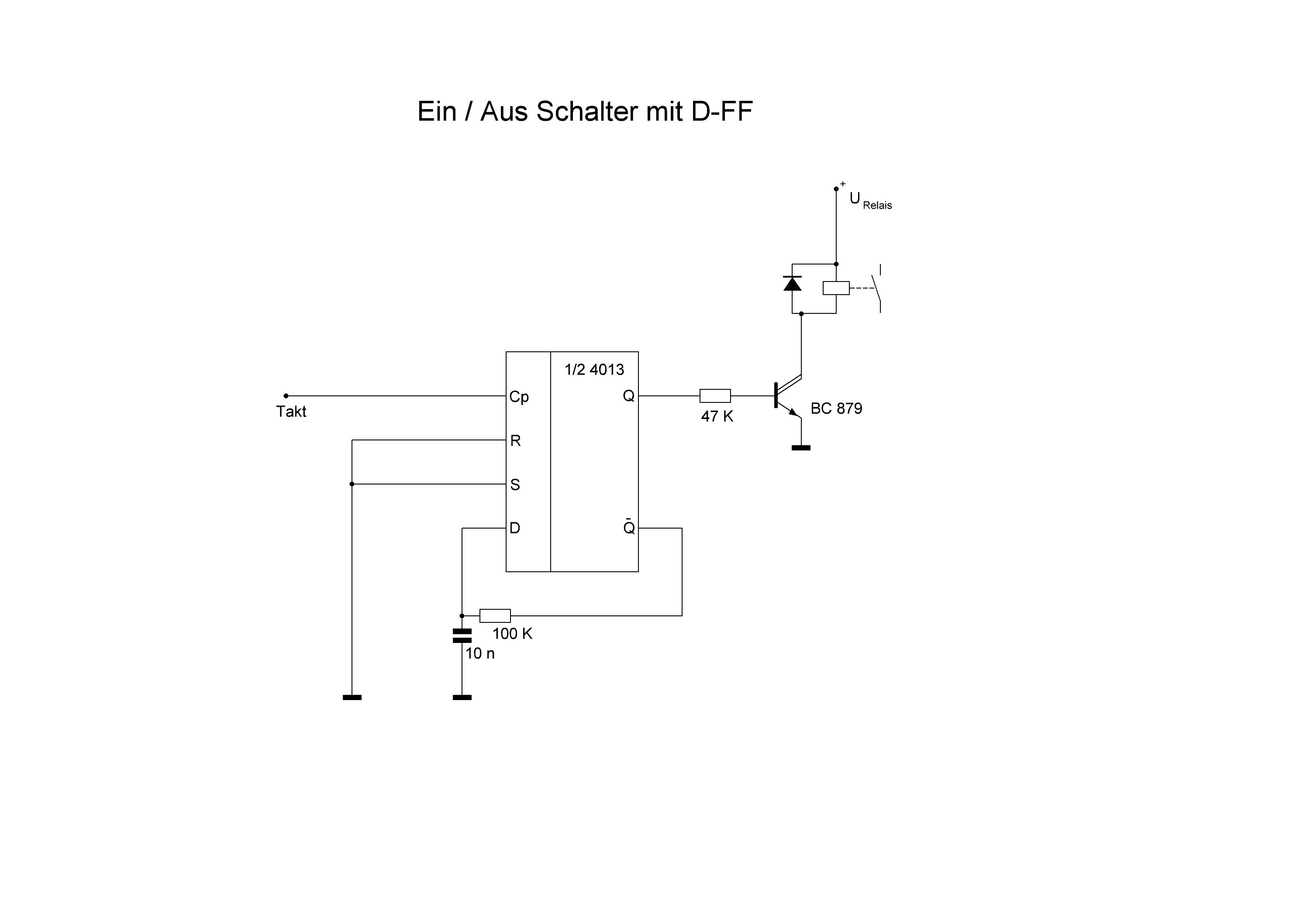 Wilson schrieb: > ouh und 1N4001 hab ich auch welche... ja die diode geht auch . das kann man auch mit nem cmos ic 4013 gleich 2* aufbauen. das rc glied 100k/10n dient der entprellung. ich hab so ein 7 fach relais mit der µsps(atmega32) realisiert. optokoppler am eingang 12v/230v~ relais am ausgang. ich stell mal die schaltung mit dem cd4013 rein. mfg