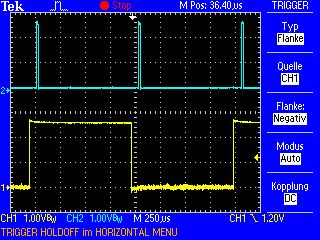 Holler schrieb: > Es könnte ja so einfach sein: warum habe ich nicht einfach den Pin 13, > also OC1A angelötet. Hab aber nun mal Pin 14 genommen, der heisst OC1B. > Habe gerade nochmal kontrolliert. Hier ist (leider) kein Fehler. Der Fehler ist in deinem Kopf. Mit diesem Setup ist auch nicht zu erwarten, dass sich irgendwas am Verhältnis der beiden Signale verändert. Deine Erwartungshaltung ist falsch. Das Oszi Bild spiegelt genau das wieder, was zu erwarten ist. Die blauen Pulse hängen zeitlich ein wenig hinter den gelben Flanken nach. Das ist der Zeitversatz, der vom Auftreten des Interrupts bis zum Anspringen der ISR und abarbeiten des Codes bis zum LED-Pintoggeln vergeht. Aber: Alle beiden Ereignisse sind an OCR1B gekoppelt (und indirekt an OCR1A, dieses Register steuert aber nur die Wiederholfrequnz. Mit einem zeitlichen Versatz der beiden Signale hat es nichts zu tun).