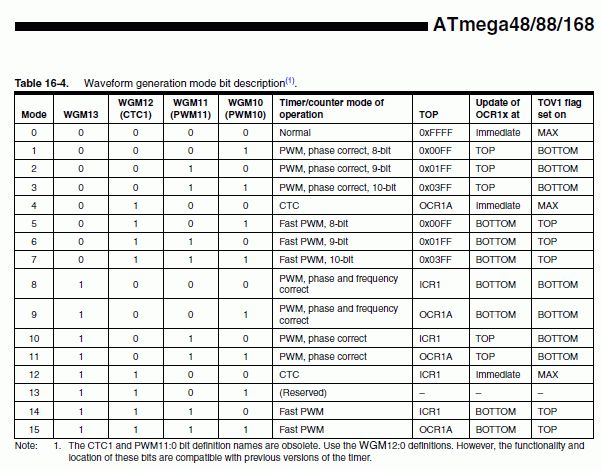 Sicher muss der Fehler irgendwo liegen. Aber der B-Pin toggelt ganz sicher in Abhängigkeit von OCR1A. Natürlich kann man das auch auf den A-Pin mappen, muss man aber nicht. Und der CTC-Mode geht meiner Meinung nach nur mit Steuerung über OCR1A, siehe angehängten Datenblattauszug. Wie schon gesagt, der OC1B toggelt perfekt. Mit OCR1A kann ich dessen Frequenz einstellen. Wo es klemmt, ist ein Interrupt zum Zeitpunkt bevor der Zähler OCR1A erreicht. Das wollte ich mit OCR1B auslösen, klappt aber nicht. Der ausgelöste Interrupt hat nichts mit dem Wert in dem Register zu tun. @ Karl Heinz Buchegger: sorry für die Bitmaps, werde zukünftig sowas wie ldi temp, 1<<OCIE1B schreiben.