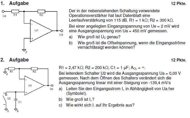 Bei den oben angegebenen Werten stellt sich am NI-Eingang eine Spannung von etwa +3,5mV ein. Aber eigentlich müsste die Ausgangsspannung der Schaltung bei idealem OPV negativ, also etwa -600mV sein. Da in der Aufgabe aber +450mV stehen, muss der OPV eine Offsetspannung von etwa -3,5mV haben. Die Differenzeingangsspannung ist Ud=Uoff+Ua/Vo und das ist praktisch gleich Ud=Uoff, weil Ua/Vo=450mV/600.000=0,75µV.