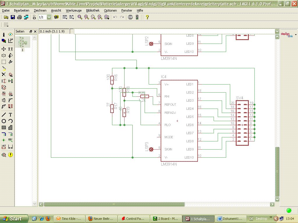 Hi Community :) Ich habe 4 LM3914 so beschaltet wie im Anhang einsehbar. Ich habe einen Probeaufbau mit einem einzelnen LM3914 aufgebaut und er hat einwandfrei funktioniert :D Jetzt habe ich das alles auf einer gefräßten Platine aufgebaut. Nur leider funktioniert es jetzt nich mehr :/ Ich lege eine Spannung an Pin 5 an und nur eine LED leuchtet. Bei zweien an der Obergrenze und bei zweien an der Untergrenze... Von Lötbrücken bzw Spänen ist nichts zu sehen. Ich habe kein Ahnung warum es nicht funktioniert und ich bin am Ende.... Habt ihr vllt ne Idee? Danke schon mal im Vorraus Gruß Timo