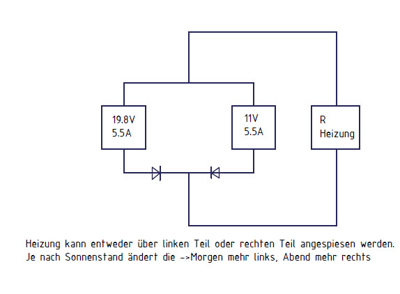Hier ist es schon sehr gut erklärt: Beitrag "Re: Erklärung gesucht" Schaltet man 37 Zellen á 0,55 Volt zusammen, ergibt das eine Nennspannung von 37 * 0,55V = 20,35 Volt. Durch den 3,6 Ω Widerstand fließt somit ein Strom von: 20,35 V / 3,6 Ω = 5,65 A Das kommt den 5,5 A, die das Modul maximal liefert sehr nahe, daher ist der Betrieb hier optimal in Hinblick auf die (Heiz-)Leistung. simon simon schrieb: > Ich habe im Anhang ein Layout für eine mögliche Verkabelung. Ist dies > elektrotechnisch möglich? Möglich: Ja, Sinnvoll: Nein. Denn hier wird das oben beschriebene verletzt. 11 V / 3,6 Ω = 3,056 A und das wäre ungleich den 5,5 A, die die Zelle kann, somit blieben ca. 5,5 A - 3,1 A = 2,4 A ungenutzt. > Im Anhang, wenn ich das richtig sehe, braucht es hier Dioden. Stimmt > das? Wenn es zu Teilabschattungen kommen kann, dann auf jeden Fall. Frage: Um wie viele Sitzkissen geht es, und gibt es vor Ort keinen Netzanschluss? Das wäre deutlich günstiger. Falls es unbedingt mit der Sonne sein soll und nur tagsüber, dann wäre eine Solarthermieanlage günstiger.