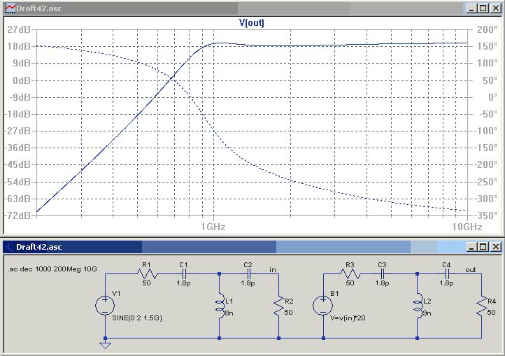 > ja, die am Eingang ist einen Tick länger. Ach so, der Eingang ist links. > Wie bist Du auf die 8nH gekommen? Hab den Mini-Rinkernrechner aufgemacht, bei Luftspulen/Induktivität eines geraden Leiters die Länge 8mm und Breite 0,15mm eingegeben -> 7,4nH. Ob 7 oder 8 oder 9nH, das schiebt die Grenzfrequenz nur ein paar MHz hin oder her. Und die Kapazitäten 1,8pF sind auch nur geraten.