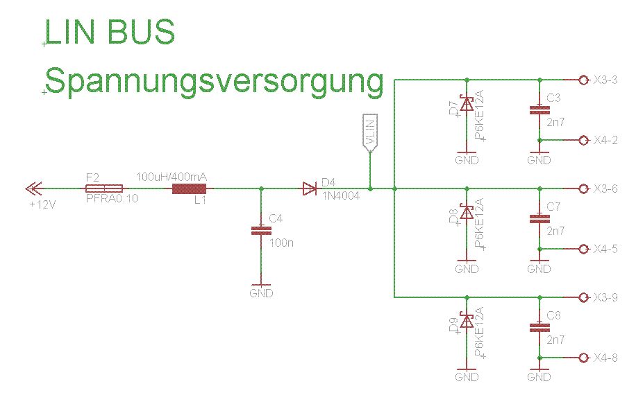 Vergiss es. LIN Bus verwendet man seit den 80ern nicht mehr. CAN BUS. Das zählt. Ausserdem scheint deine Schaltung unbrauchbar. Eine P6KE hält keiner Prüfung stand !!!