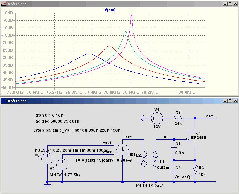 Hallo Tom Da Du von Rückkopplung auf dem Steckbrett schreibst, durch einfaches umlöten von C1 auf den Source kannst Du die Schaltung zu einem Colpitts umbauen. Die Rückkopplung läßt sich stabil/fest über C2 einstellen. In der Simulation schwingt es bei 180nF, bei größeren Werten nicht. Wenn man es nicht auf die Spitze treibt, besteht keine Schwinggefahr. Die Hüllkurve sollte noch nicht periodisch ausschwingen. Bei mir liegen nach der ersten Stufe bereits 100mVss an. Die Entfernung beträgt 150km. Die verbesserte Selektivität reich nicht aus, um 88.125kHz zu unterdrücken. Aber Röhrenfernseher scheinen in Deiner Umgebung nicht mehr vorhanden zu sein. PS. Bezüglich Röhrenfernseher hat sich das mit Deinem Post überschnitten.