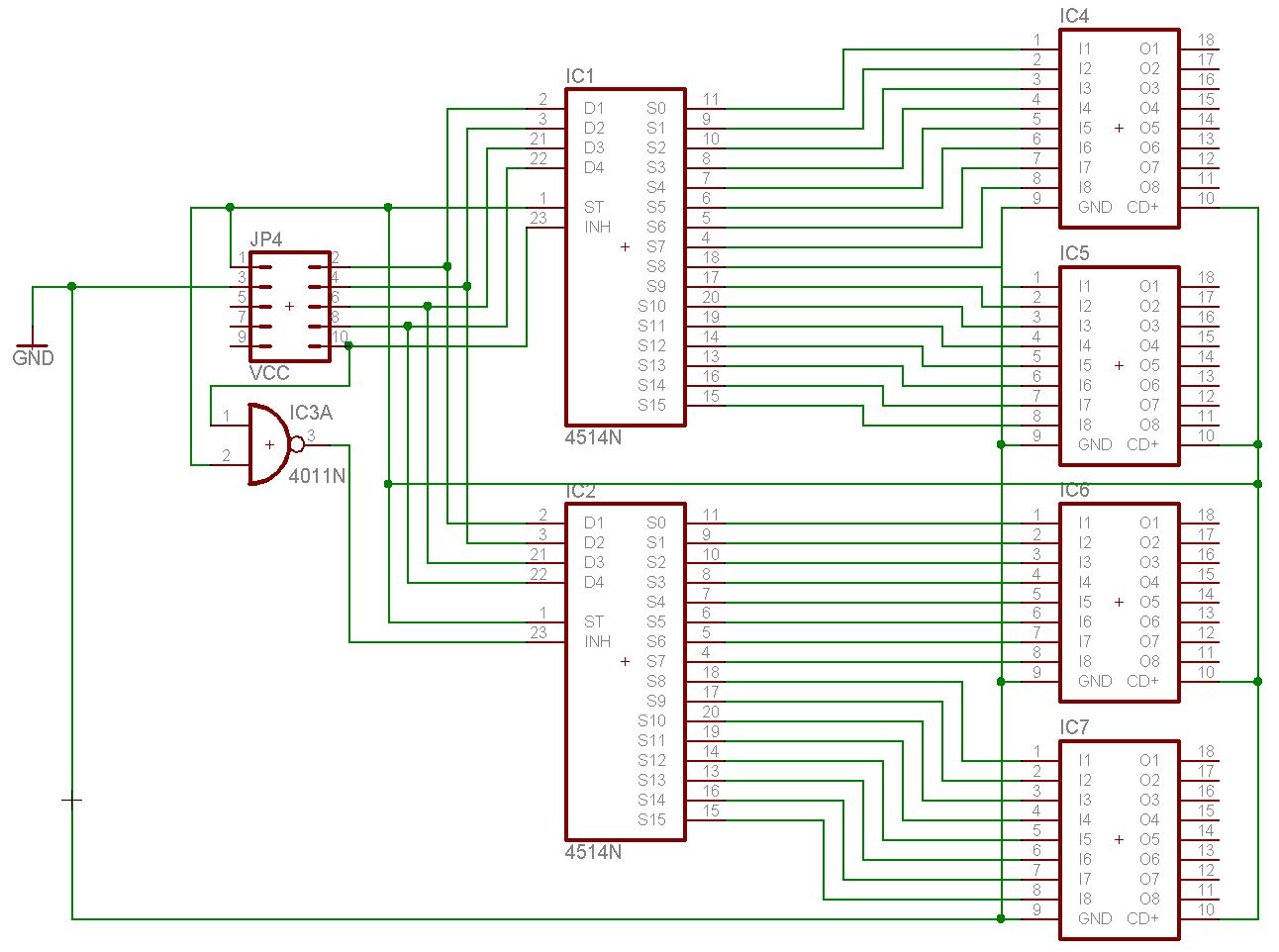 Hallo leute! ich habe eine frage: Ich muss min. 16 Relais schalten können, dazu habe ich mir Überlegt, dass ich die Schaltungen wie folgt aufbaue: |µC (4-6 PORTs zur Verfügung)|->| multiplexer (74HC4515N)| -> |Treiber |-> |Relais|.. Siehe auch Bild im Anhang Zu meinem Problem: Ein multiplexer kann jeweils nur einen Schalter schalten, ich bräuchte aber einen IC der verschiedene ausgänge Schaltet...beispielsweise wenn es 16 ausgänge hat, dass ich ausgang 0 1 und 2 schalte und die anderen alle aus sind oder alle ausgänge auf einmal schalte etc...Habt Ihr eine ahnung welchen IC ich nehmen könnte bzw. eine andere Methode anwenden kann?? Danke schonmal im vorraus!