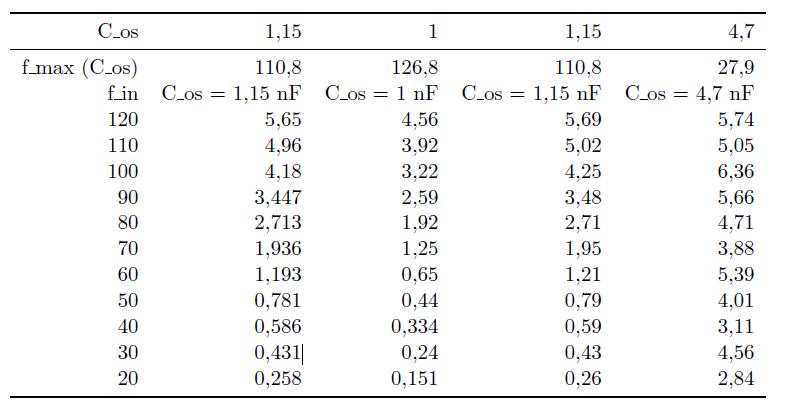 Hallo, ich habe gerade meine Aufzeichnungen von gestern rechnerisch hinterlegt und bin gerade, um ehrlich zu sein, ein bisschen frustriert, weil der AD650 autark auch nicht richtig funktioniert... Ich habe den one shot Kondensator Cos immer variiert und dann den AD650 mit verschiedenen Frequenzen f_in beaufschlagt. Die ausgegebene Spannung habe ich nebenstehend immer in V_out beschrieben. Diesen realen Werten habe ich mal die rechnerisch zu erwartenden Werte gegenübergestellt und naja, ich kann nichtmal einen wirklichen Zusammenhang nachweisen, weil sich augenscheinlich auch die Referenz der Schaltung immer ändert ..... Ich hoffe wirklich sehr auf einen guten Rat, weil ich hier leider mit meinem Latein am Ende bin :/