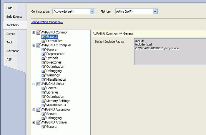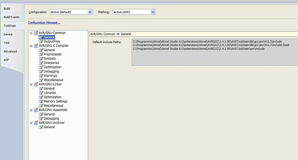 Die make.exe ist bei mir auch woanders: C:\Programme\Atmel\Atmel Studio 6.0\make Anbei die Details zur Output Ausgabe "Build" und "General": ------ Rebuild All started: Project: Blink_LED, Configuration: default AVR ------ Build started. Project "Blink_LED.cproj" (ReBuild target(s)): Target "PreBuildEvent" skipped, due to false condition; ('$(PreBuildEvent)'!='') was evaluated as (''!=''). Target "CoreRebuild" in file "C:\Programme\Atmel\Atmel Studio 6.0\Vs\Compiler.targets" from project "E:\Konvertierte AVRStudio Projekte vom Buch\Blink_LED\Blink_LED\Blink_LED.cproj" (target "ReBuild" depends on it): Task "RunCompilerTask" C:\Programme\Atmel\Atmel Studio 6.0\Vs\Compiler.targets(23,5): MSB6004: The specified task executable location "C:\WinAVR-20080512\utils\bin\make.exe" is invalid. Done executing task "RunCompilerTask" -- FAILED. Done building target "CoreRebuild" in project "Blink_LED.cproj" -- FAILED. Done building project "Blink_LED.cproj" -- FAILED. Build FAILED. ========== Rebuild All: 0 succeeded, 1 failed, 0 skipped ========== 11:23:47: [WARNING] Skipped reading Build Dependency settings from source project. It is either invalid or not provided., ModuleName: ProjectImporter.Core 11:23:51: [WARNING] Skipped reading Pre/Post build event settings from source project. It is either invalid or not provided., ModuleName: ProjectImporter.Core 11:24:23: [WARNING] The device [attiny13] is not supported in ASF Version [] that is used in the project Blink_LED 11:24:23: [WARNING] Include Path not found : include 11:24:23: [WARNING] Include Path not found : include-fixed 11:24:23: [WARNING] Include Path not found : C:\WinAVR-20080512\avr\include 11:24:23: [WARNING] Include Path not found : include 11:24:23: [WARNING] Include Path not found : include-fixed 11:24:23: [WARNING] Include Path not found : C:\WinAVR-20080512\avr\include 11:24:23: [WARNING] Include Path not found : include 11:24:23: [WARNING] Include Path not found : include-fixed 11:24:23: [WARNING] Include Path not found : C:\WinAVR-20080512\avr\include 11:24:23: [WARNING] Include Path not found : include 11:24:23: [WARNING] Include Path not found : include-fixed 11:24:23: [WARNING] Include Path not found : C:\WinAVR-20080512\avr\include 11:24:23: [WARNING] Include file not found : C:\WinAVR-20080512\avr\include\avr\iotn13.h 11:25:39: [WARNING] Include Path not found : include 11:25:40: [WARNING] Include Path not found : include-fixed 11:25:40: [WARNING] Include Path not found : C:\WinAVR-20080512\avr\include 11:25:40: [ERROR] Failed to Retrieve the Version Information for the utilty C:\WinAVR-20080512\bin\avr-gcc.exe with arguments --version 11:25:40: [ERROR] Failed to Retrieve the Version Information for the utilty C:\WinAVR-20080512\bin\avr-gcc.exe with arguments --version 11:25:40: [ERROR] Failed to Retrieve the Version Information for the utilty C:\WinAVR-20080512\bin\avr-ar.exe with arguments --version 11:25:40: [ERROR] Failed to Retrieve the Version Information for the utilty C:\WinAVR-20080512\bin\avr-gcc.exe with arguments --version 11:29:45: [WARNING] Include Path not found : include 11:29:45: [WARNING] Include Path not found : include-fixed 11:29:45: [WARNING] Include Path not found : C:\WinAVR-20080512\avr\include 11:29:45: [WARNING] Include Path not found : include 11:29:45: [WARNING] Include Path not found : include-fixed 11:29:45: [WARNING] Include Path not found : C:\WinAVR-20080512\avr\include 11:29:45: [WARNING] Include Path not found : include 11:29:45: [WARNING] Include Path not found : include-fixed 11:29:45: [WARNING] Include Path not found : C:\WinAVR-20080512\avr\include 11:29:45: [WARNING] Include Path not found : include 11:29:45: [WARNING] Include Path not found : include-fixed 11:29:45: [WARNING] Include Path not found : C:\WinAVR-20080512\avr\include 11:29:46: [WARNING] Include file not found : C:\WinAVR-20080512\avr\include\avr\iotn13.h 11:49:03: [WARNING] Include Path not found : include 11:49:03: [WARNING] Include Path not found : include-fixed 11:49:03: [WARNING] Include Path not found : C:\WinAVR-20080512\avr\include 11:49:03: [ERROR] Failed to Retrieve the Version Information for the utilty C:\WinAVR-20080512\bin\avr-gcc.exe with arguments --version 11:49:03: [ERROR] Failed to Retrieve the Version Information for the utilty C:\WinAVR-20080512\bin\avr-gcc.exe with arguments --version 11:49:03: [ERROR] Failed to Retrieve the Version Information for the utilty C:\WinAVR-20080512\bin\avr-ar.exe with arguments --version 11:49:03: [ERROR] Failed to Retrieve the Version Information for the utilty C:\WinAVR-20080512\bin\avr-gcc.exe with arguments --version