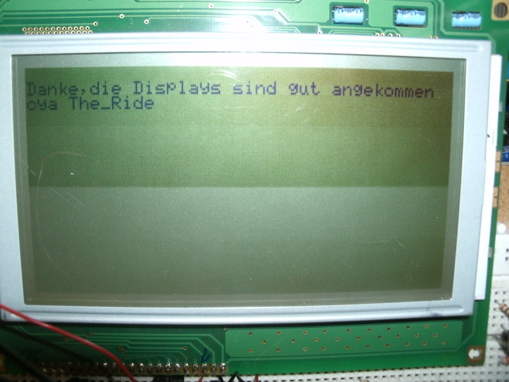Hallo, ich habe ein Grafik Display abzugeben. Es ist mit einem T6963c Controller bestückt. Ich habe das Display hier ( http://shop.e-lab.de/de/Module/Boards/DisplaysKeyboards/Graphic-LCD-240x128 ) gekauft und hätte dafür gerne 35€ (zzgl. Versand). Gruß Nico