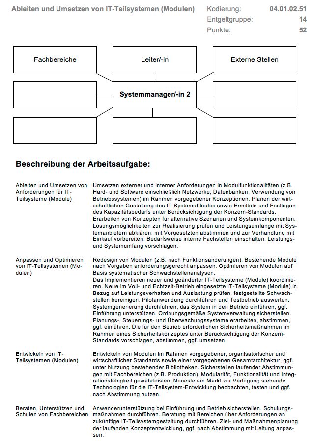 > Korrekt, mir ist bekannt dass die Ziel EG 16 ist. Allerdings haben die > es erreicht (trotz Hochschulabschluss) dass die Ziel EG beim > Systemmanager 2 die 14 ist. Hatten dort "alle" die ich kannte (mit der > entsprechenden Stelle natürlich). So kann man das auch hindefinieren. Nachtrag: ich hab es mal rausgesucht...