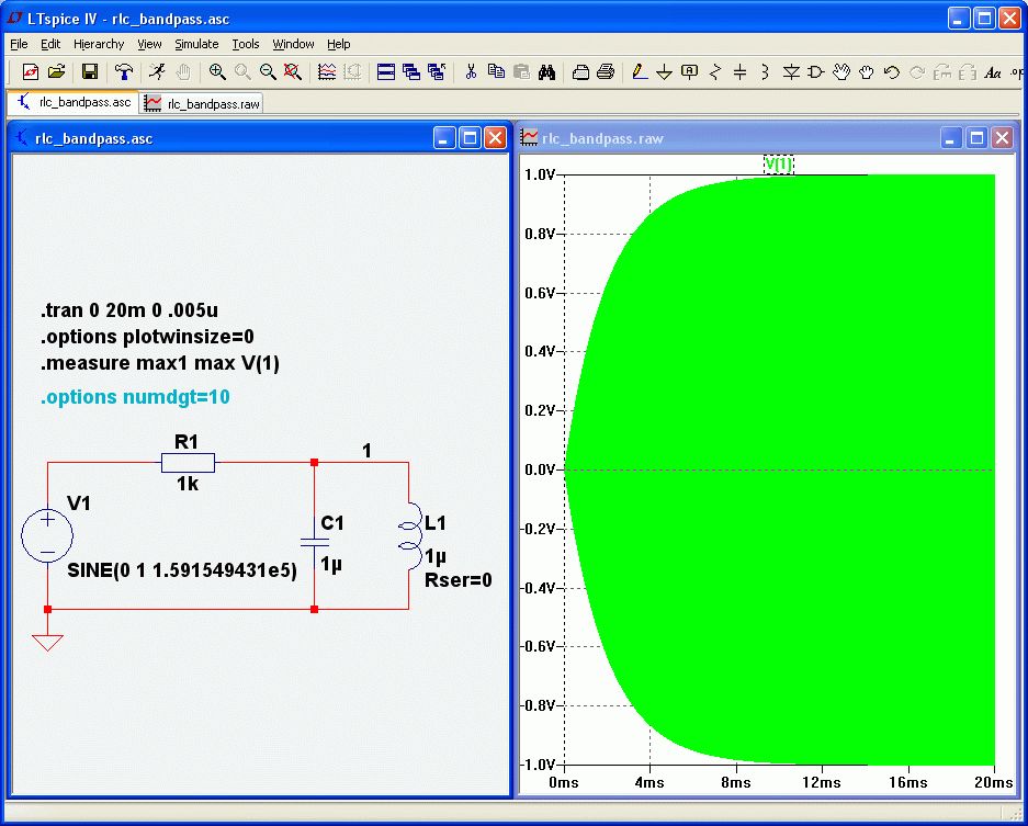 Also mit 10ns Schrittweite ist man auch schon fast bei 1V. Mit 5ns komme ich auf 0,9989V. Dein Schingkreis hat eine sehr hohe Güte. Wenn man Rser der Spule auf 0Ohm setzt, dann ist Q = R1/sqrt(L/C)= 1000 Mit dem Default-Serienwiderstand von 1mOhm ist Qges nur noch 500 und die Amplitude ist dann nur noch 500mV. Deine gewählte Kombination aus L und ist sehr ungünstig für die Realisierung eines Schwinkkreises hoher Güte. Du solletst Z=sqrt(L/C) >> 1Ohm wählen.