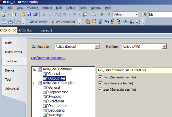 Hallo, ich habe bei mir das Atmel Studio 6 installiert und ein C-Programmm erstellt. leider erzeugt mir das Studio keine .hex Datei, die ich ja zum flashen des Controllers brauche... Ich nutze das Atmel Studio 6 auch beruflich, auf meinem Firmenrechner wird die .hex automatisch im jeweiligen Projektordner erstellt, wenn man "Start Debugging" ausführt. Gibt es irgendeine Einstellmöglichkeit hierfür? mfg Matthias