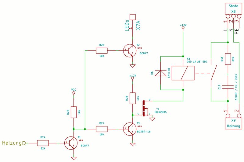 Hallo, bin dabei mir ein Steuerung für ein kleines Gerät für ein Wasserbad zu bauen. Um das Heizelement zu betreiben, habe ich an ein Relais gedacht. Das Heizelement, welches ich schon da habe, wird mit 230V~ betrieben. Da ich bisher noch nicht mit Relais gearbeitet habe, möchte ich euch bitten mal auf meinen Entwurf zu schauen. Den habe angehängt. Einige Fragen sind bei mir aufgekommen, als ich mich in die Materie eingelesen habe: 1: Das RC-Glied, welches im Moment parallel zu den Schaltkontakten des Relais hängt, kann ich das dort belassen? Oder ist es besser das parallel zum Heizelement zu hängen? 2: Reichen 2W für den Widerstand des RCGliedes? Oder muss der mehr aushalten? Würde diesen Widerstand nehmen: http://www.reichelt.de/2W-Metall-1-0-Ohm-820-Ohm/2W-METALL-82/3//index.html?ACTION=3&GROUPID=3083&ARTICLE=2371&SHOW=1&START=0&OFFSET=500& 3: Ich möchte das G6D-1A-ASI 12VDC von Omron benutzen. Reicht es da aus, wenn ich den Mosfet (T4, IRLR2905) weg lasse und den Vorwiderstand von (T3, BCX54-16) neu berechne? Denn laut Angaben hat das Relais eine Leistungsaufnahme im Betrieb von 150mW bei 12V. http://www.reichelt.de/Miniaturrelais/G6D-1A-ASI-12V/3//index.html?ACTION=3&GROUPID=3292&ARTICLE=79359&SEARCH=G6D%201A%20ASI%2012V&SHOW=1&START=0&OFFSET=500& 4: Als Controller benutze ich einen Atmega48A-AU. Kann ich da direkt die Transistoren T2 (BC847) und T3 (BCX54-16), über ihren Basiswiderstand, an den Ausgang hängen, und mir so T1 (BC847) sparen. Den T2 brauche ich, da die LED, welcher dieser ansteuert, sich auf einer extra Platine befindet, die direkt mit der Frontplatte verbunden ist. Und dort habe ich nur 5V zur Verfügung. Vielen Dank für eure Antworten, schon im Voraus. René