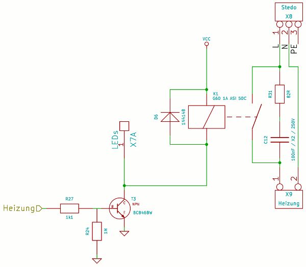 @ René M. (renejena) >Das Heizelement, welches ich schon da habe, wird mit 230V~ betrieben. Da Ganz schön viel Aufwand für so ein Relais. Kann man alles deutlich einfacher mit einem Transistor machen. Siehe Relais mit Logik ansteuern. >1: Das RC-Glied, welches im Moment parallel zu den Schaltkontakten des >Relais hängt, kann ich das dort belassen? Ja. >Oder ist es besser das >parallel zum Heizelement zu hängen? Nein. >2: Reichen 2W für den Widerstand des RCGliedes? Ja. >3: Ich möchte das G6D-1A-ASI 12VDC von Omron benutzen. Kann man machen. Beachte aber die Leiterbahnabstände zwischen 230V und der Steuerspannung. >Reicht es da aus, >wenn ich den Mosfet (T4, IRLR2905) weg lasse und den Vorwiderstand von >(T3, BCX54-16) neu berechne? T1 reicht aus, siehe oben. >4: Als Controller benutze ich einen Atmega48A-AU. Kann ich da direkt die >Transistoren T2 (BC847) und T3 (BCX54-16), über ihren Basiswiderstand, >an den Ausgang hängen, Ja.