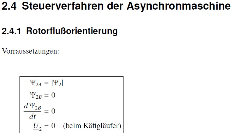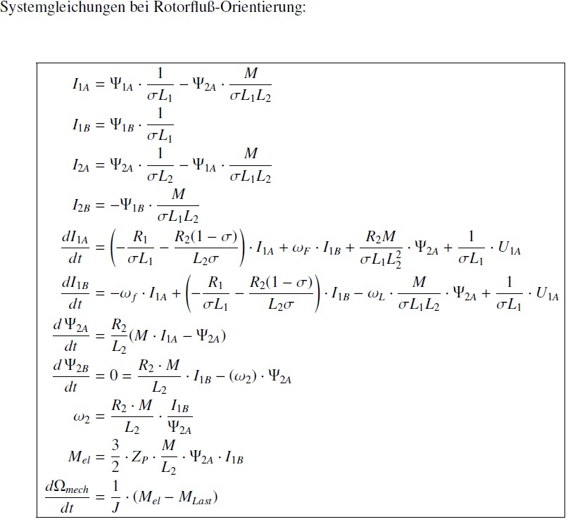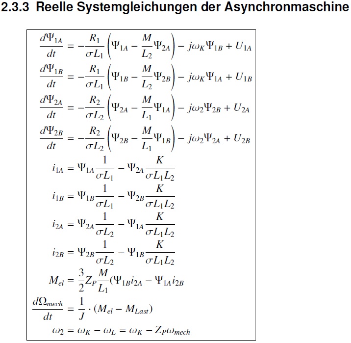 Hallo mit einander. In der Uni haben wir im Seminar für Elektrische Maschinen die Asynchronmaschine bei Rotorfluß-Orientierung besprochen. Dabei wurden die Gleichungen für die Rotorfluß-Orientierung hergeleitet und da hab ich ein Verständnisproblem. Ich hab euch mal 3 Bilder dran gehängt. In Bild 1 sind die Reellen Systemgleichungen der AsM zu sehen. Bild 2 zeigt die Vorraussetzungen bei Rotorfluß-Orientierung und in Bild 3 sind letztenendes die Gleichungen bei Rotorfluß-Orientierung zu sehen. Wie man da vorgehen muss glaub ich auch verstanden zu haben. Man nimmt die Vorraussetzungen und setzt sie in die Reellen Systemgleichungen ein. Das klappt an und für sich auch so ganz gut, mit Ausnahme für die Gleichungen der zeitlichen Ableitung der Ströme I_1A und I_1B. Ich hab viel rumprobiert aber komme nie auf das selbe Ergebnis. Übersehe ich da was? Könnt ihr mir da bitte helfen?