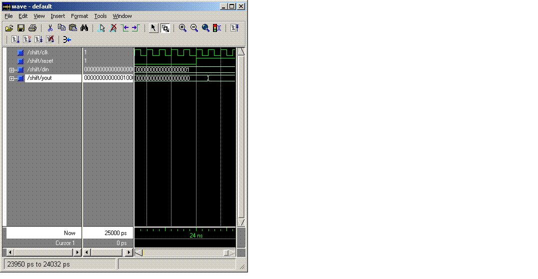 besser: library std_arith; use std_arith.all; process(clk) begin if rising_edge(clk) then if reset_n = '0' then Dout <= Yin; elsif Dout <= Yin(Yin'high - shw) downto 0) & conv_std_logicvector(0,shw); end if; end if; -- Bibliothek und Konvertierungsfunktion sind sicher falsch getippert, -- muss ich bei gelegenheit mal ausprobieren. Deine Lösung funktioniert mit shw = 4, durch den asynchronenen reset wird das design grösser und DIN brauch NICHT in die sensitity list. Das problem in der ersten Variante ist das nichtinitialisierte Signal TEMP.