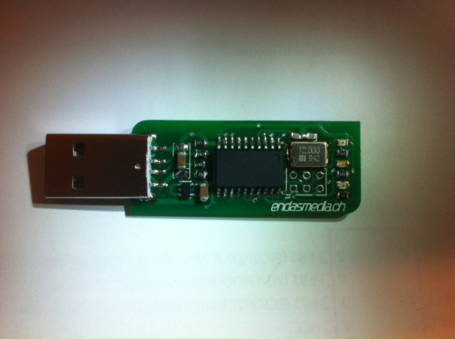 Hallo liebe Community Ich habe mir letztens einen USB RF-Stick entwickelt. Nachdem die Teile da waren, wurde alles schnell aufgebaut. Ich war wirklich begeistert von dem kleinen Teil. Hier mal kurz die Eckdaten: - CC2500 Funkmodul - AT45DB642 64MBIT Flash Speicher (per SPI) - AtTiny 4313 Mikrocontroller - OBDEV USB Library (http://www.obdev.at/products/vusb/index-de.html) - 100% Plug n Play dank HID (keine Treiber notwendig) Technische Details: - 12MHz Quarz - 3 LED's - 3.3V Spannungsregler on-Board (TPS73033) Anwendungsmöglichkeiten: - Als Kryptographische einheit (nur Flash und uC bestückt oder auch nur uC) - Als Funkkomunikationseinheit (z.B. für Sensoren welche auch ein CC2500 besitzen) - Als verhältnismässig kleiner Datenspeicher (8MByte) - Und vieles mehr Kommuniziert wird mit dem Stick mittels eines Kommandozeilen Programms, welches bei obdev.at als OpenSource heruntergeladen werden kann. (Wirklich sehr einfach in der Anwendung) Ich habe noch einige Prints übrig, und würde diese gerne an Interessierte Leute abgeben. Angeboten wird nur der Print für 2€ oder Print inkl. USB Stecker für 2.30€ Versand: 2€ (von CH nach DE/AT) Innerhalb Schweiz: 1CHF Bei Interesse, bitte hier im Forum posten, eine PN senden oder direkt per Mail an claudio . hediger (ät) gmail .com - Der Flash Chip befindet sich im BGA Gehäuse. Doch ich war überrascht, wie einfach dieser zu Löten war. Ein Heissluftfön und eventuell etwas Flussmittel genügt völlig. 1) Flussmittel dünn auf den Print aufragen. 2) IC nach dem Bestückungsdruck ausrichten 3) Heissluftfön auf ca 300C° stellen und mit geringem Luftdurchfluss heizen, bis sich das IC etwas absenkt. 4) Fertig! :) Dauert ca 1-2 Minuten. Grüsse Claudio