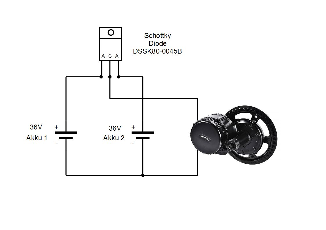 Hallöchen.. Ich habe mir überlegt eine Akkuweiche nach dem Dioden-Prinzip selber zu bauen. Dafür will ich eine preiskünstige Schottky-Diode vom Typ DSSK80-0045B verwenden. Link: https://cdn-reichelt.de/documents/datenblatt/A400/DSSK80-0045B.pdf Der Vorteil im Vergleich zu einer "Ideal Diode" ist der günstige Preis und der einfache Schaltungsaufbau ohne Steuerelektronik. Nachteilig an der Schottky-Diode ist der etwas höhere Spannungsabfall (UF) im Durchlassbereich. Bei einer Ideal Diode beträgt dieser je nach Schaltungsaufwand nur einige MilliVolt. Ich habe einen Dioden-Typ ausgewählt, der bei einer Belastung von 20A, einen sehr geringen Spannungsabfall von nur 0.3V hat. Die Sperrspannung liegt bei 45V. Bei einer Dauerlast sollte die Diode mit einem kleinen Kühlkörper versehen werden. Das Ganze kann man, wenn Platz vorhanden ist, in die Akkuaufnahme am Fahrradrahmen unterbringen, oder in einem kleinen wasserdichten Kunststoffgehäuse. 1.Bild Schottky Diode 2.Bild Schaltungsaufbau Akkuweiche mit Schottky Diode 3.Bild Schaltungsvariante Ideal-Diode Gruß Rolf