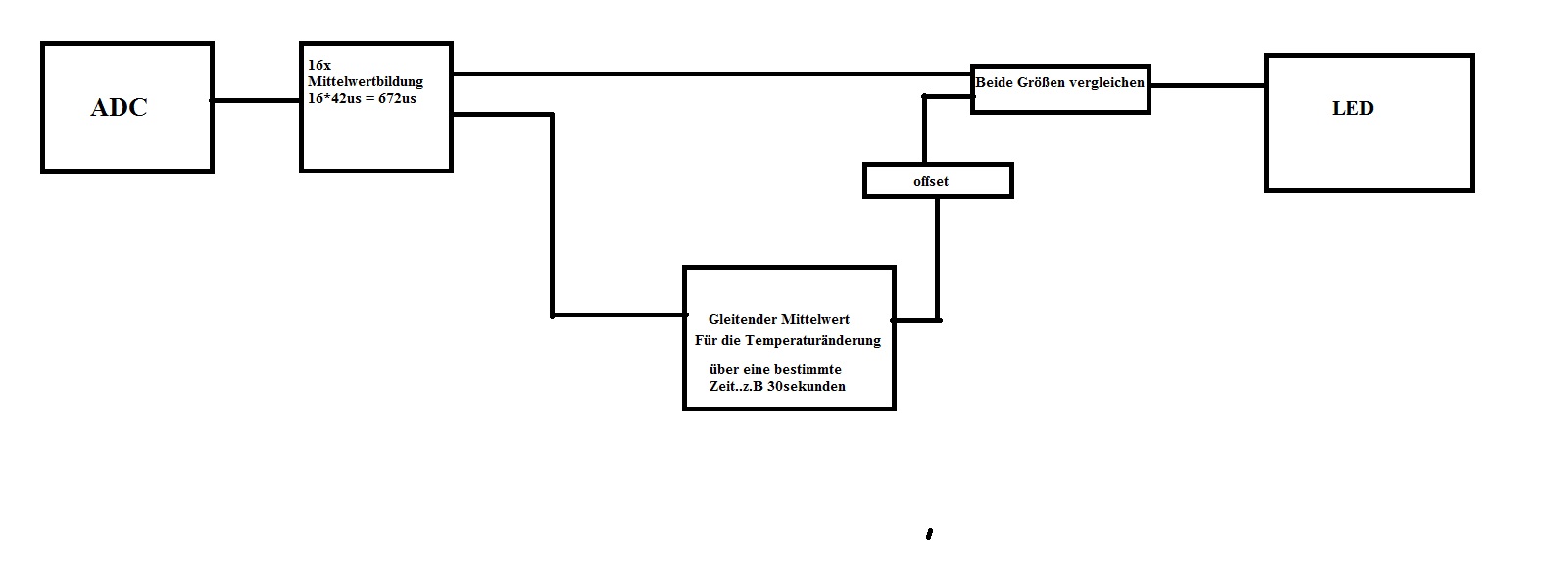 So langsam verstehe ich das ganze.. mit dem speicher habe ich mich versehen..der uc hat noch einen 3540Byte zur verfügung. Anbei habe ich gerade eine Blockschaltbild gezeichnet. Die Anwendung habe ich in dem Thread " ADC Mittelwert bilden in C" beschrieben. Es ist für 12 kap. Tasten. Beim Tastendruck wird die Spannung geringer. Das Code war so, dass ich eine Feste Schwelle bestimmt habe und sobald dies unterschritten wurde soll die LED leuchten(if(ADCwert < 400) LED=ON) Leider bleibt die Schwelle nicht immer gleich, deshalb wollte ich einen dynamische schwelle berechnen über eine bestimmte zeit. Der Karl hatte mir empfohlen 2 mittelwerte zu bilden. der eine ist eine kurze mittelwert(ADCWertneu = Summe /16) der auf tastendruck reagiert, da es nur 672us dauert. die zweite ist dann eine lange mittelwert(gleitender mittelwert).