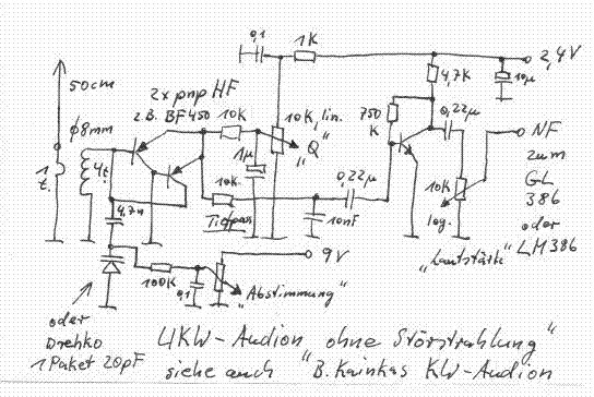 Sie können auch diese Schaltung benutzen. Hier gibt es auch um einen Empfänger met einer RF-Vorstufe, Hartly Rückkopplungsaudion, Puffer. Hier gibt es nicht um ein Pendel-Audion.