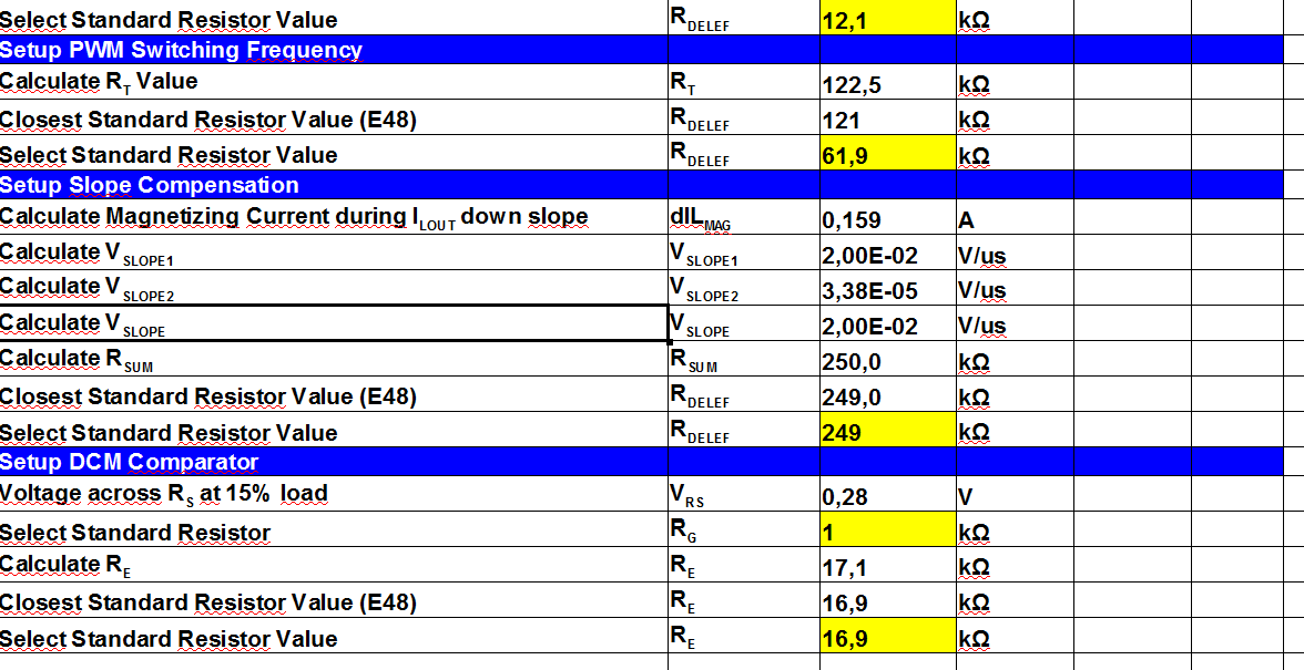 Das sind Tipp-Fehler. Das Schema ist immer so, dass zuerst ein Widerstandwert berechnet wird, dann kommt in der nächsten Zeile der nächste Wert aus der E-Reihe und dann kommt eine Zeile, in die man von Hand den Widerstandswert eintippen kann, den man in seiner Schaltung verwenden möchte. Wenn also in der ersten Zeile R_T steht, dann müssen die beiden anderen auch so heisen und nicht R_DELEF (typ. Copy&Paste-Fehler). Ich hab mich auch mal längere Zeit mit diesem Controller und der Excel-Tabelle beschäftigt; es dauert schon eine Weile, bis man das alles verstanden hat. Noch ein Tip: Einige Berechnungen in dieser Tabelle sind schon etwas seltsam bzw. schlecht nachvollziehbar, vor allem, wenn man die Formeln nicht anschauen kann (Tabelle ist geschützt). Es gibt für Excel aber ein Tool, mit dem man diesen Schutz entfernen kann...