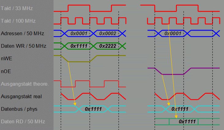 Hier ist ein Bild. Der 50 MHz Takt geht raus auf den Baustein und ist um 180 Grad verschoben. Damit arbeitet er seinen Signale ab. Bei den rückgelesenen Signalen am Datenbus sollte es in etwa auch passen, mit dem ausgegebenen Takt zu sampeln. Leider ist die Phasenverschiebung bei den Datenbussignalen nach nOE irgendwie derart, dass ich auf der Flanke liege. Wie erreiche ich, dass die annehmenden FFs in den IOBs alle dieselbe Situation sehen?