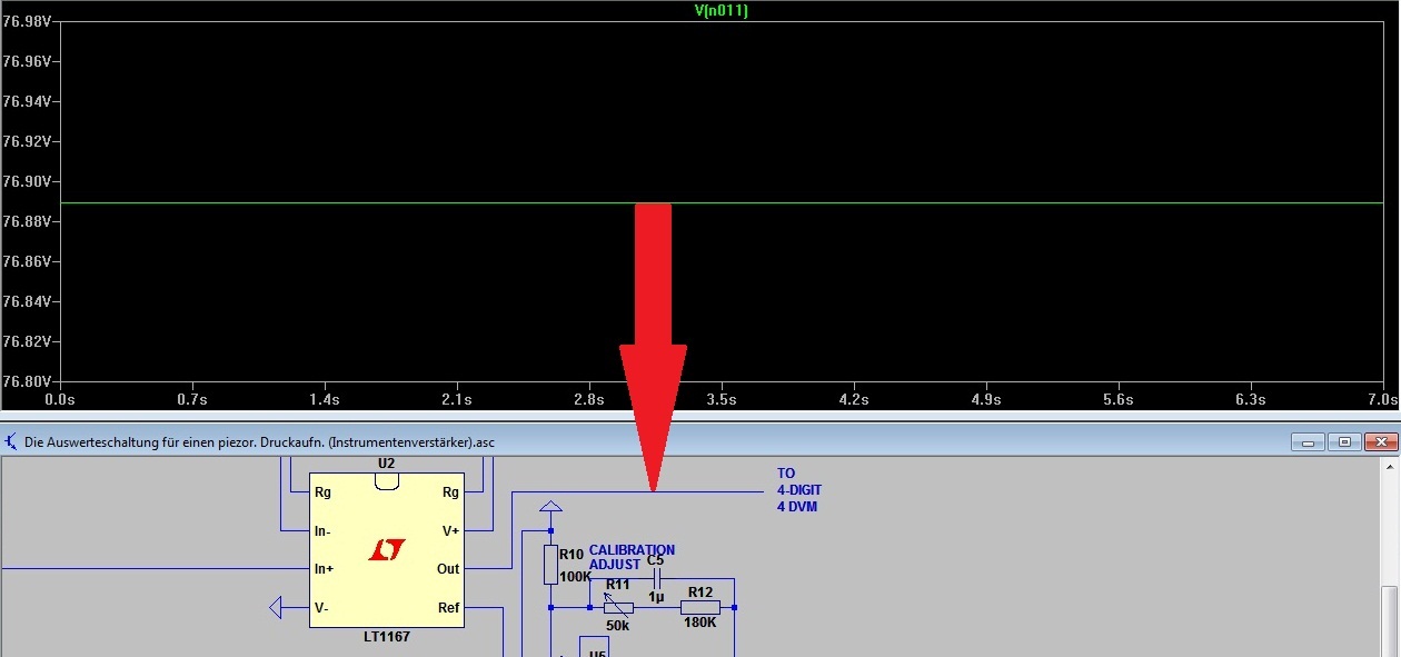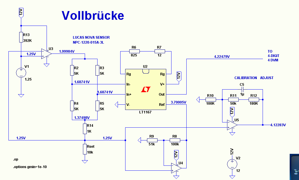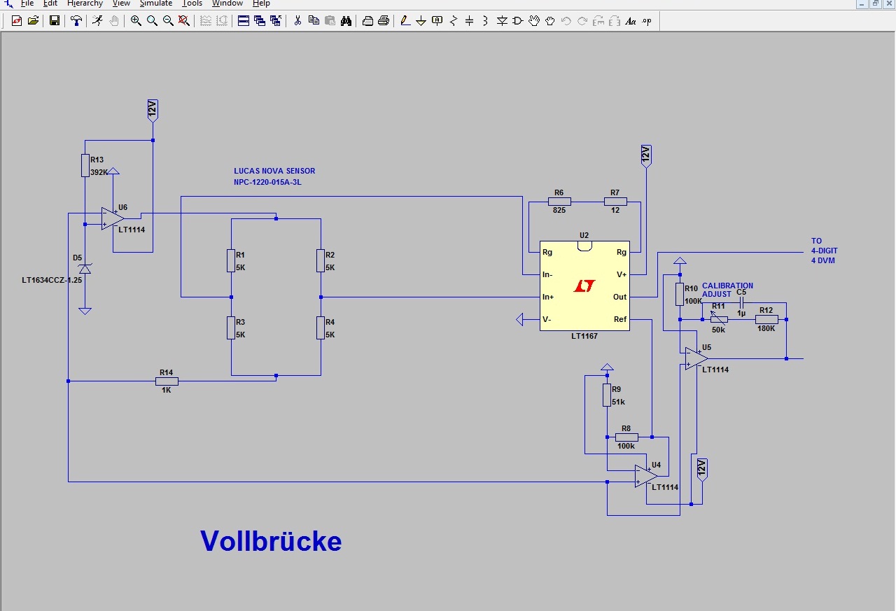 Meine Simulation klappt nun, meine 3 einzigsten Fragen, die ich nun noch hätte sind: 1. Stimmt meine Spannungsversogung nun? 2. Bräuchte die genauen Model-Daten der Diode D5 LT1634CCZ-1.25, da ich es nicht gefunden habe im Internet. 3. Was ist mit dem Rset, da der veränderliche Widerstand ja im Gehäuse ist bei den Brückenwiderständen R1, R2, R3, R4? Oder muss ich die Widerstände R1, R2, R3, R4 entfernen? Ich finde leider im Internet nicht das Symbol LUCAS NOVA SENSOR NPC-1220-015A-3L für LT Spice... Danke im Voraus, Ihr habt mir mit euren bisherigen Antworten wirklich sehr geholfen :)