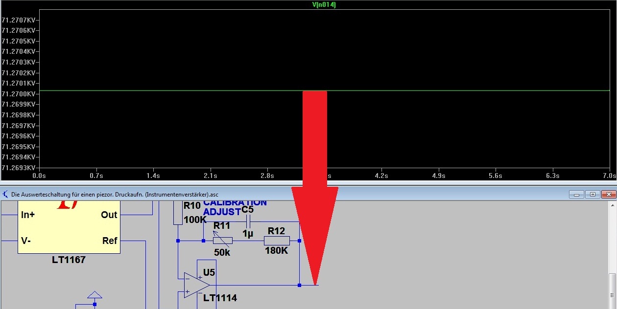 "Rset" ist wirkungslos, weil kurzgeschlossen. Übrigens ist nur einer der Widerstände der Messbrücke aktiv. Die anderen sind konstant. Grundsätzlich gilt bei Computern: Wenn man Sche... eingibt, kommt auch Sche... raus. (Hilft natürlich nicht wirklich). Der Schaltplan ist da eine Sache, die Stimulierung der Schaltung mit Versorgungsspannung und -strom eine weitere Sache und die Parametrierung der Messmittel eine andere Sache. Im Netz gibts mehrere Tutorials in deutscher Sprache wo man so einiges lernen kann. Man muss es nicht mal vollständig durcharbeiten. z.B.: http://www.gunthard-kraus.de/LTSwitcherCAD/CD_LTSwitcherCAD/pdf-file/LTspice_4_d.pdf Yalu X. schrieb: > 1. Nenne uns die Quelle, wo du die Schaltung her hast. http://pdf1.alldatasheet.com/datasheet-pdf/view/70327/LINER/LT1167.html