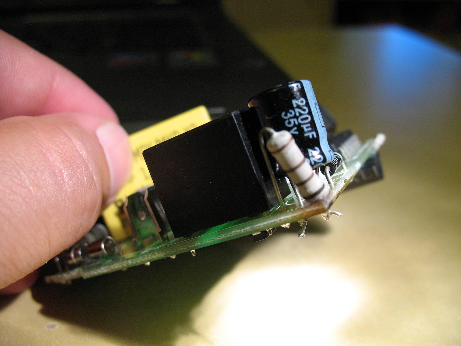 Hallo zusammen, ich denke Netzteil ist die richtige Bezeichnung, falls nicht bitte korrigieren. Ich bin kein Profi und bräuchte Hilfe bei der Fehlersuche. Nach ca. 1-monatigem Gebrauch, liess sich der Heizstrahler (3 Stufen, 200, 400, 600 Watt) nicht mehr einschalten. Mit meinem Halbwissen habe ich das Gehäuse aufgeschraubt und gedacht den Schaden erkannt zu haben. Ein aufgeblähter Kondensator 25V / 220uF. Ersatz besorgt nun 35V / 220uF da gleicher nicht verfügbar, eingelötet, Gerät eingeschaltet, nach 5 Sekunden gab es leichte Rauchzeichen. Sofort augeschaltet. Die braune Verfärbung am Widerstand aufgrund der Hitze war vor Austausch des Kondensators vorhanden. Jetzt messe ich 500 Ohm am betroffenen Widerstand im eingebauten Zustand. Wie sollte ich vorgehen? Danke schonmal!