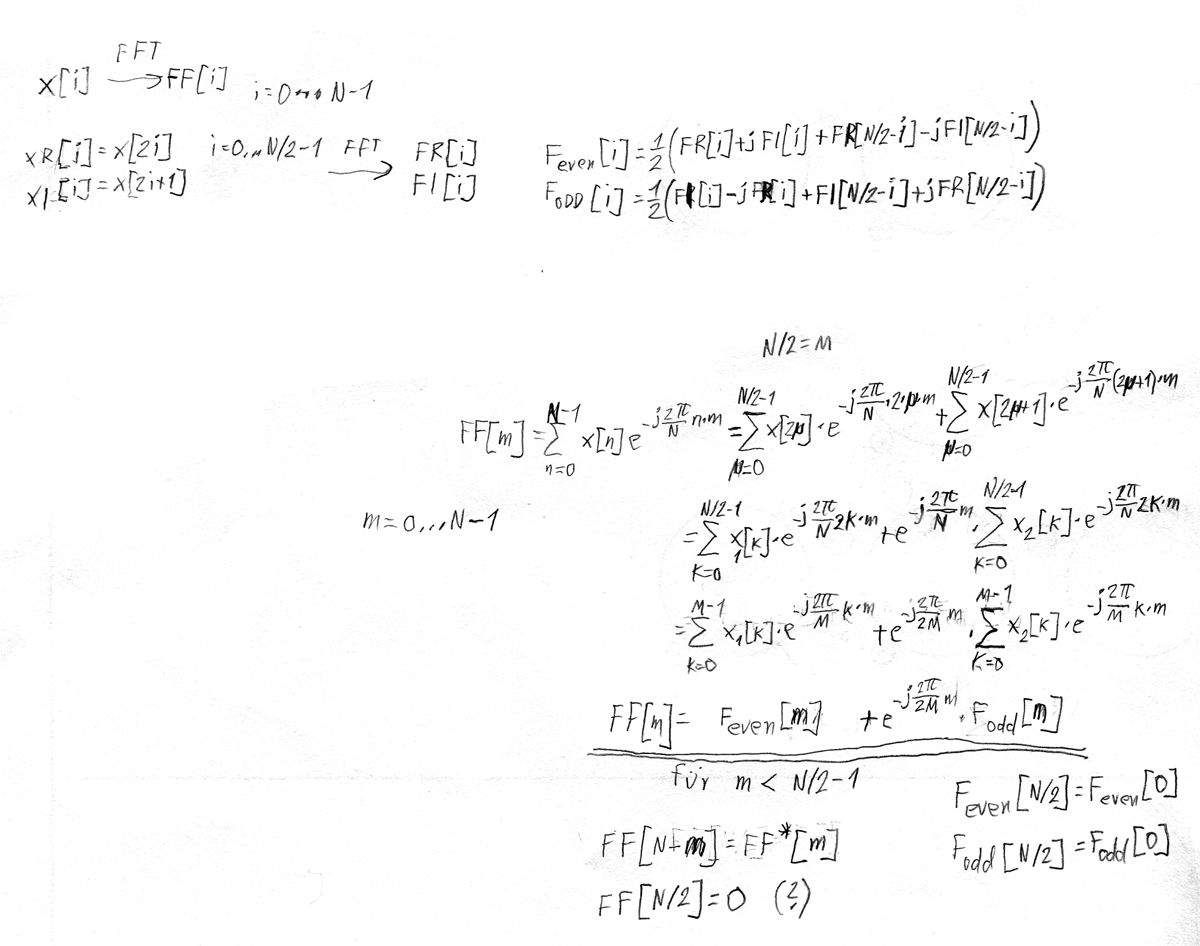 Hallo, folgendes Problem: ich will eine FFT mit 4096 Werten in einem LPC1769 machen. Der hat 2*32K RAM für die FFT braucht man aber bereits 4096*2*sizeof(float) = 32k Speicher. Da in dem Projekt auch noch etwas sonstiger Speicher gebraucht wird, reicht das RAM erwartungsgemäß nicht aus. Für die FFT muß man ja 4096 komplexe Zahlen im Speicher vorsehen, also 2 float zu je 4 Bit. Da bei mir aber die Einganswerte alle reelwertig sind und damit alle imaginären Anteile Null sind, gibt es Tricks, das Ganze mit einer FFT mit 2048 Werten durchzuführen. Es gibt z.B. ein Script hier: www.zhaw.ch/~rumc/dsv1/unterlagen/dsv1kap3dftfft.pdf Auf den letzten beiden Seiten wird es beschrieben. Die reelen 4096 Eingangswerte werden abwechselnd auf die Real- und Imaginärteile der 2048-FFT verteilt, dann die FFT durchgeführt und anschließend daraus die 4096 komplexen Ergebnisse berechnet. Das geht, weil im Ergebnis Werte mit den Indizes i und 4096-i konjugiert komplex zueinander sind. Leider ist die Beschreibung ausgerechnet in dem Punkt in der Doku fehlerhaft, die Indizes gehen dort durcheinander. Die Eingangswerte gehen von 0 bis M-1, die FFT-werte von 0 bis M/2-1, soweit ist das korrekt. Aber später im Ergebnis werden Indizes von 0 bis M-1 für die Ergebniswerte (das ist richtig, es gibt ja 4096 Stück) auch in die Ausgangswerte der FFT eingesetzt und das geht nicht, denn die FFT liefert ja nur 2048 Werte, also Indizes von 0 bis M/2-1. Die einzige andere Doku, die diese Thema anschneidet, fand ich über Google bei der FH München und TH Wien (die Dokumente sind identisch), aber genau bei dem Punkt geraten da wieder die Indizes durcheinander, man muß dann wieder FFT-Ergebnisse mit Indizes bis 4095 adressieren... Ich brauche leider die 4096-FFT, reserviere ich Speicher für eine 2048-FFT, reicht es aus, jetzt brauche ich "nur" noch eine fehlerfreie Doku, die das Verfahren der Schachtelung korrekt beschreibt. Noch besser wäre natürlich ein Codebeispiel ;-) Eine Doku würde mir aber reichen. Die Rechengeschwindigkeit ist nicht sooo kritisch, ich brauche nur eine Lösung, die mit halb soviel Speicher auskommt als die Standardlösung mit der normalen FFT. Das ganze soll für einen digitalen Audioverstärker verwendet werden, dort kommen FIR-Filter mit 4095 Koeffizienten (symmetrisch, daher lineare Phase) zum Einsatz. Die Filter selber laufen in FPGAs, die Koeffizienten dafür werden aber vom LPC1769 berechnet und einmal in die FPGAs geladen. Ich berechne einen Sollfrequenzgang und mithilfe einer IFFT daraus die Filterkoeffizienten (die müssen noch mit einer Fensterfunktion versehen werden). Die IFFT ist ja identisch zur FFT, sie unterscheidet sich nur in einem konstanten Faktor für alle Ergebniswerte. Bei mir ist sogar der reele Sollfrequenzgang symmetrisch bzgl. i und 4096-i, so daß die IFFT nicht nur konjugiert komplexe Werte liefert, sondern sogar rein reele, sonst würde das FIR-Filer auch nicht funktionieren. Eine Simulation ergibt auch schon gute Ergebnisse. Da die FIR-Filter bis in den Baßbereich wirksam sein sollen, müssen die schon 4095 Koeffzienten haben, sonst kann man den unteren Baßbereich nicht mehr individuell beeinflussen. Gruß Andy_W