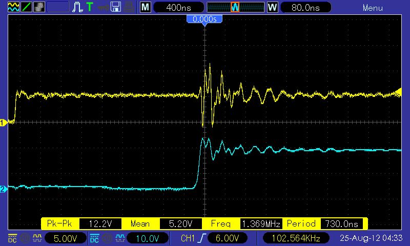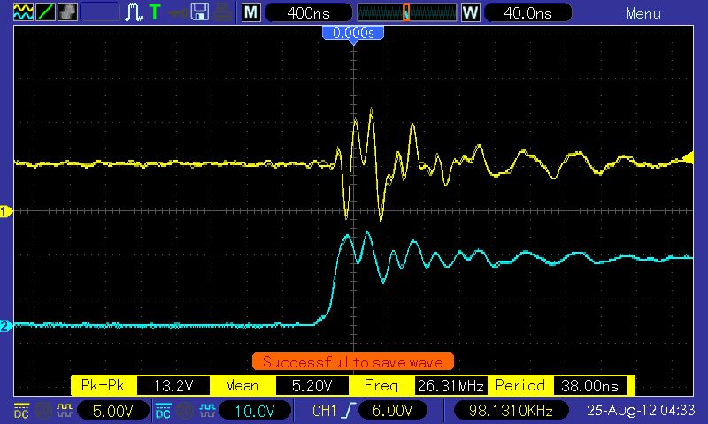 >>Was sind denn die Signale in deinem Screen-Shot? Sind das Gate-Signale >>oder die Spannung in der Brücke? Es ist keine H-Brücke, sondern ein Synchronschaltregler. Gelb ist der Signalverlauf an dem TTL in-Pin des Treibers und Blau der Spannungsverlauf am Drain des High-Side Mosfet. >>Es wäre auch möglich, dass die Störung dadurch zustande kommt, dass für >>einen kurzen Zeitpunkt beide Mosfets gleichzeitig an sind Danke für den Tipp. Werde ich mal untersuchen. >>Die Induktivität der Speicherdrossel hat dabei nichts zu bedeuten; die >>Schwingungen werden durch die Induktivitäen der Leiterbahnen und >>Bauteile bestimmt; diese liegen eher im nH-Bereich. Deswegen muss der >>Kondensaotr deutlich größer werden als du berechnet hast; vermutlich im >>Bereich von ein paar nF. Danke. Wird im Wiki nicht so ganz deutlich.