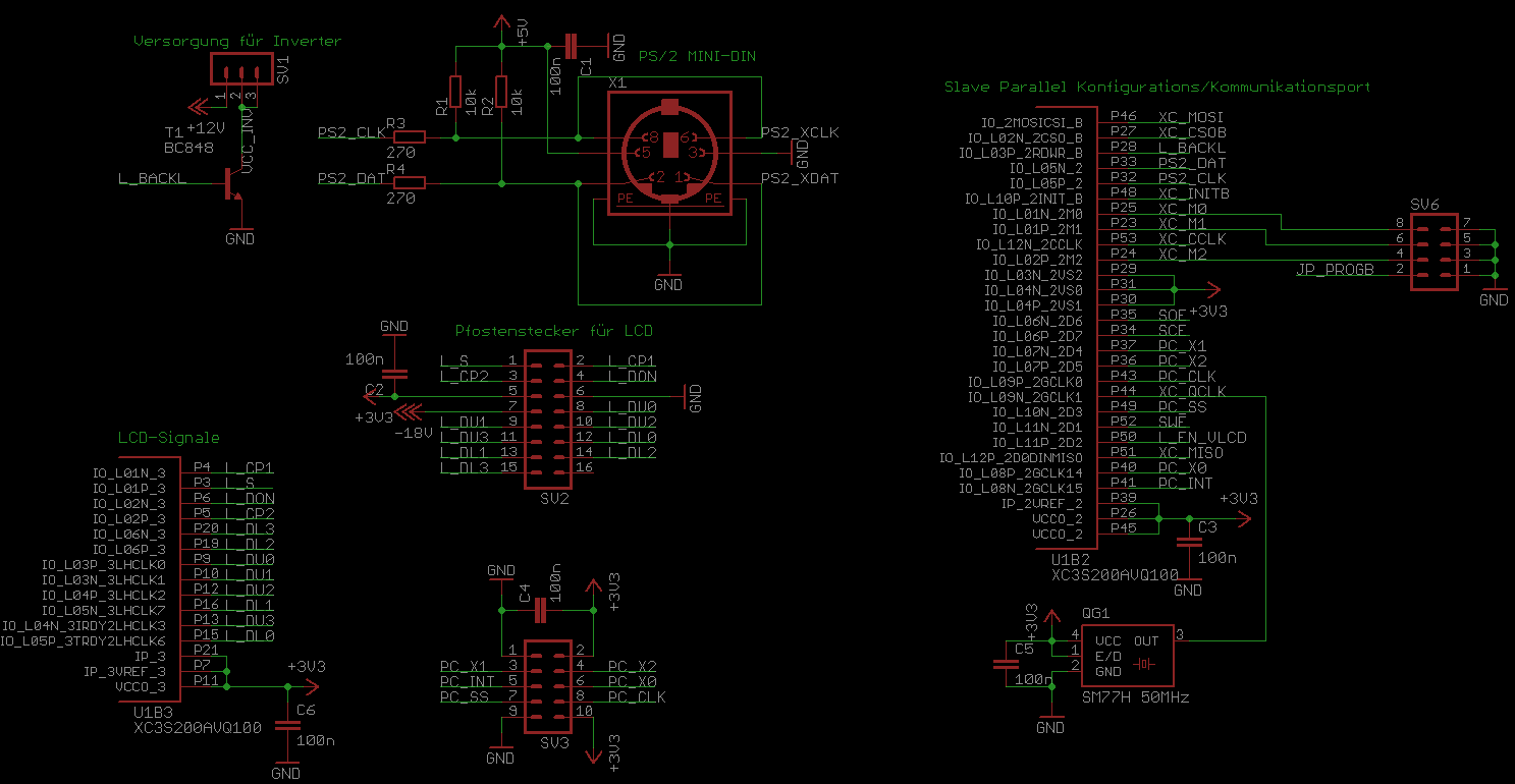 Wolfgang M. schrieb: > Hab mich vielleicht falsch ausgedrückt. Ich meinte einen Schaltplan wo > man den Spartan 3A mit minimaler externer Beschaltung sieht. Das Board > von Trenz sieht gut aus. Kann man so bestimmt aufs Breadboard stecken... Anbei ein Projekt, was es nie zur Realisierung schaffte - das zugehörige LCD war nicht gut genug, es lohnte nicht. Ist also nicht getestet und damit ohne Gewähr. Stromversorgung: Das FPGA braucht 1.2V V_Core. V_aux ist fürs JTAG/Config-Interface und kann entweder 2.5V oder 3.3V sein. Beim Spartan 3 ohne A war V_aux auf 2.5V festgelegt. Das FPGA hat 4 IO-Bänke, jede mit ihrer eigenen Spannungsversorgung zwischen 1.2V und 3.3V. So kann man verschiedene IO-Standards implementieren. Das FPGA ist RAM-basiert und nach dem Einschalten leer. Die Konfiguration kann es entweder seriell oder Parallel als Slave von einem Controller bekommen, oder es kann sich die Daten als Master aus einem seriellen oder parallelen Flash holen. Beim Spartan 3 ohne A musste man Xilinx-Spezial-Flashes verwenden, die das spezielle serielle Konfigurationsprotokoll konnten. Die sind natürlich sauteuer. Der Spartan 3A kann auch normale SPI-Flashes wie ST25M80 (Flashes, keine EEPROMs, die wären eh zu klein) benutzen, die natürlich viel billiger sind. Der Spartan 3A XC3S200A braucht 149516 Bytes an Konfigurationsdaten, also für einen normalen AVR zu viel. Der XC3S200A (das größte, was Du löten kannst) hat 288kBits an Block-RAM, das sind 32kWorte zu je 9 Bit. Für Text plus Zeichengenerator reicht das, für Grafik nicht. Das Block-Ram ist echtes Dual-Port RAM. Wie gesagt: so kompliziert isses nicht, nur Fleißarbeit. Immer hübsch 0402 100n Abblockkondensatoren verteilen, dann passt das. Und denk an den Taktoszillator (hier 50 MHz). Per PLLs kannst Du Dir intern noch andere Takte generieren, aber einen Oszillator brauchst Du. 50 MHz sind nichts, was Du über mehr als ein paar mm Leiterbahn transportieren möchtest. Ich empfehle Dir: Schau Dir den vorgeschlagenen Epson Controller an. Der ist für Dich einfacher zu handhaben, auch weil er seinen Grafikspeicher eingebaut hat. Für ein normales FBAS-Signal reicht QCIF mit 352*288 Pixel (viertel Vollbild zu 704*576 Pixel) aus, und das müsste noch ins interne RAM des Controllers reinpassen. Wenn Du mehr brauchst: es gibt zig verschiedene Typen, auch welche mit mehr Speicher drin. fchk