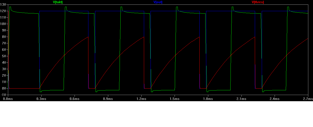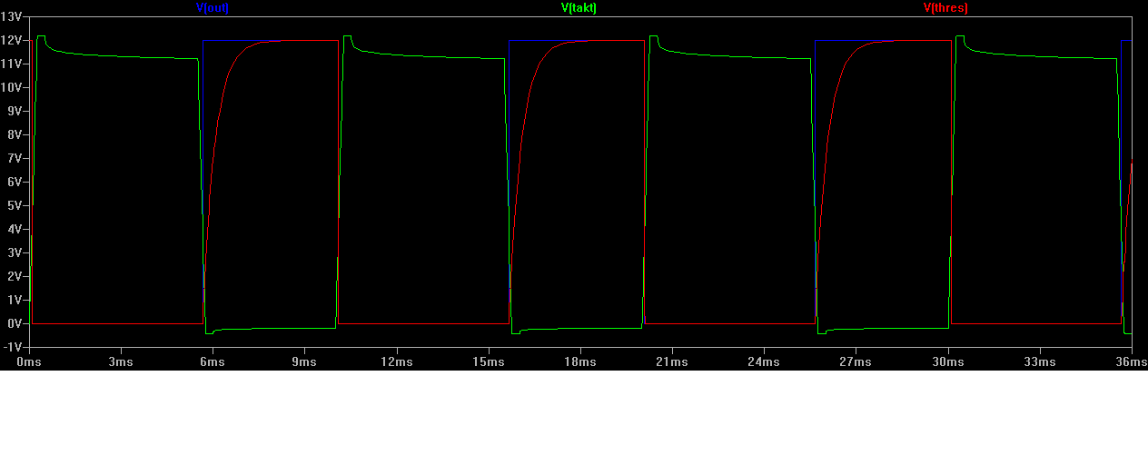 Hallo, ich versuch gerade einen simplen F/U Converter zu zeichnen. Randbedingungen: f max =2 KHt f min =100 Hz hab jetzt mal nur die Takt zu PWM gemacht, was in der Simulation bei 2 Khz auch funkrioniert. (Mit SwitcherCad) Wenn ich das aber mit 100 Hz simuliere kommt was anderes raus als gedacht. R * C *1.1 = 100nF 4 KOhm 1.1 etwa 440 uS kommt bei 2 KHt auch hin - bei 100 Hz nicht. Sollte V(out) nicht gegen 0 gehen wenn V(tresh) etwa 8V überschreitet - oder versteh ich das falsch? Auszug Wikipedia „Threshold“: Das Intervall endet, wenn die Spannung an THR größer als bei CTRL ist Gruss Heinz