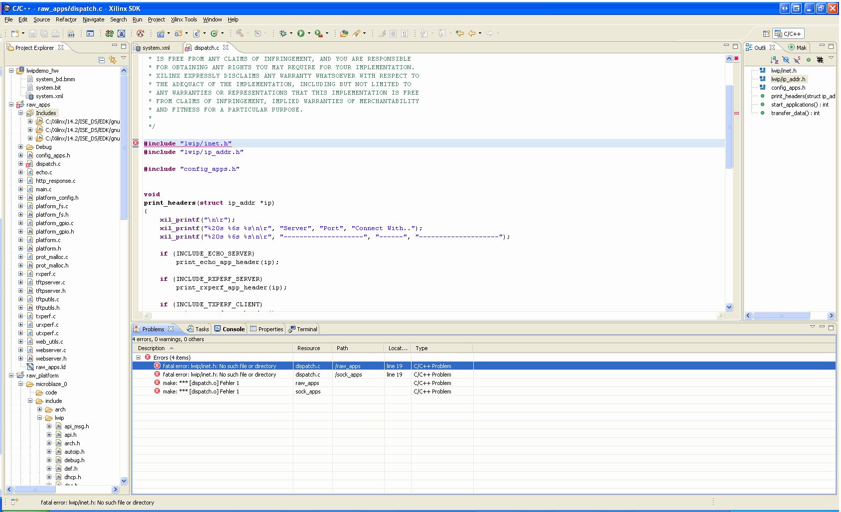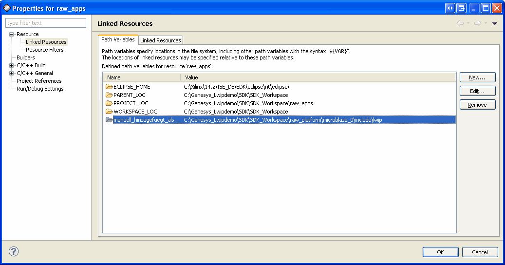 Ich verzweifle hier, ich hoffe mir kann jemand unter die Arme greifen. Board: Digilent Genesys mit einem Xilinx Virtex-5 Software: Xilinx SDK 14.2 Download von Digilent: Genesys LWIP_demo.zip Das gleiche Problem auch mit folgenden Demos, und mit anderen include Dateien: Genesys BSB_design.zip Genesys AC97_EDK_demo.zip Wenn ich die Demo versuche ins SDK zu laden, dann fehlen einige Include Dateien für das Board. Stimmt meine grundsätzliche Prozedur? Also: Ich entpacke die LWIP Demo.zip auf: C:\Genesys_Lwipdemo Ich starte Xilinx SDK und deklariere als neuen Workspace: C:\Genesys_Lwipdemo\SDK\SDK_Workspace Ich klicke auf "change hardware specification file" und wähle aus: C:\Genesys_Lwipdemo\SDK\SDK_Export\hw\system.xml und schon sehe ich sämtliche IP cores, die für das Projekt wichtig sind. Im Screenshot sieht man jedoch, dass ihm die Datei "lwip/inet.h" und "lwip/ip_addr.h" fehlt. Beide Dateien würde sich jedoch unter raw_platform\microblaze_0\include\lwip befinden. Der Compiler findet sie dort jedoch nicht, auch, wenn ich dem Projekt diesen Pfad zusätzlich als Recourcenpfad hinzufüge. Was mache ich falsch?