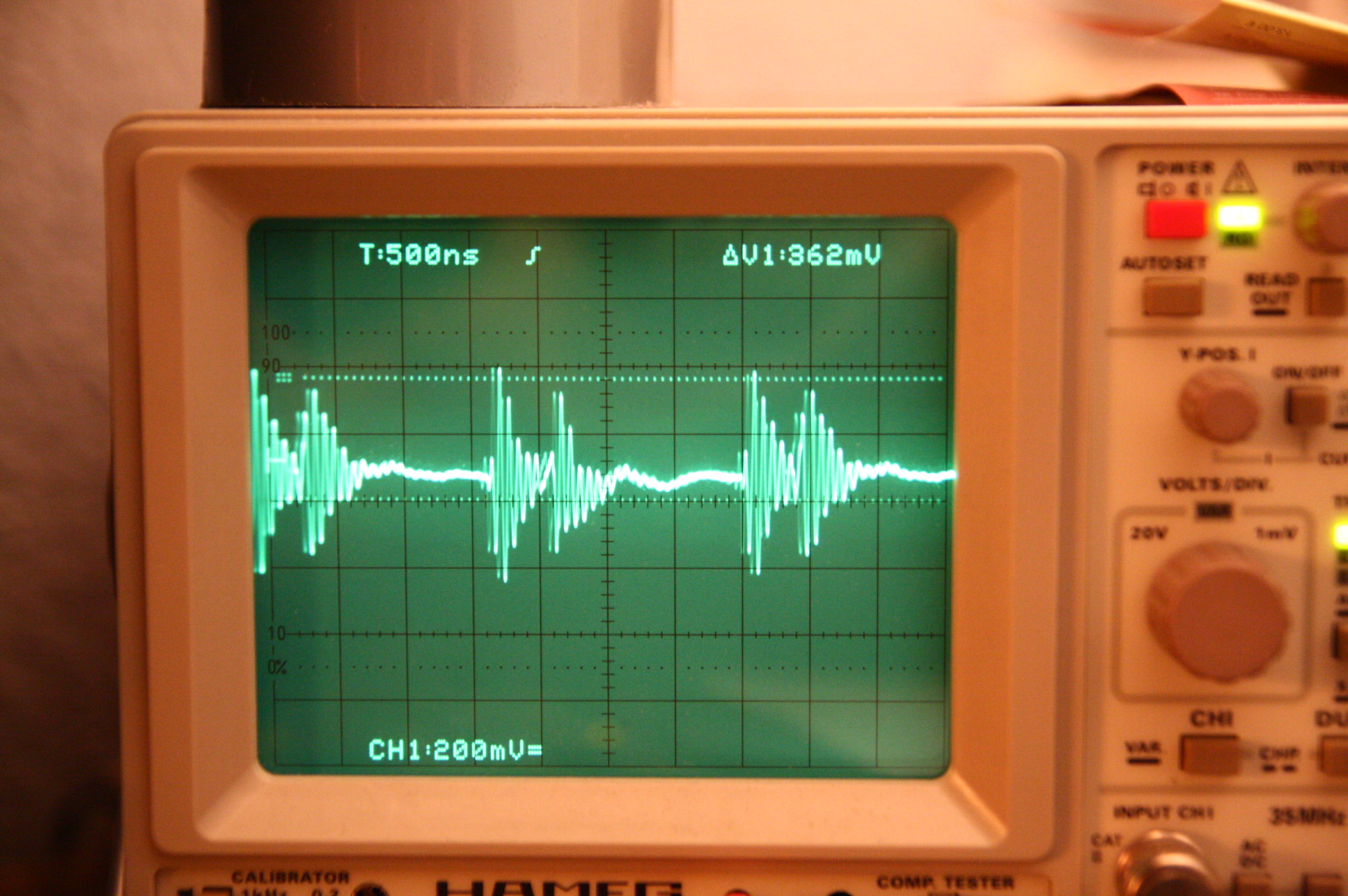 Hallo, ich bin momentan dabei, eine SSTC (Solid State Tesla Coil) zu bauen. Sie ist fast fertig. Fehlen tun mir nur noch die Sicherheitsmechanismen. Darunter soll es auch eine Überstromabschaltung geben. Das heißt, dass bei einem Kurzschluss im Endstufentreiber die Stromversorgung für diesen sofort abgetrennt werden soll. So eine Schaltung wäre zunächst kein Problem: Ein 100mR-Shunt in Reihe zur Stromversorgung -> Abfallende Spannung mit OPV verstärken und schließlich in einen Schmitt-trigger aus einem Komparator einspeisen, bei definierter Schwellspannung soll dieser dann den entscheidenden Pegel zum Abtrennen annehmen. doch die sache hat einen Haken: Der Teslatrafo und folglich auch der Endstufentreiber schwingt bei ca 300kHz. Das heißt, dass es deutliche Störspitzen in der Versorgungsspannung für diesen gibt. Die Amplitude der Störungen ist so groß, dass sie den Kürzschluss-Spannungswert am Shunt übersteigt und folglich die Überstromabschaltung ständig für ein Paar µs ansprechen würde, sofern der Komparator schnell genug ist. Ich habe vergeblich versucht, diese Störungen einigermaßen zu kompensieren - ohne Erfolg. Vielleicht könnt ihr mir einige Tipps und Ratschläge geben. Danke! Im Anhang ist ein Oszillosgramm der Spannung am Shunt im Normalbetrieb. Man kann genau sehen, dass die Störspannung ein vielfaches von der eigentlich am Shunt abfallenden Spannung ist.