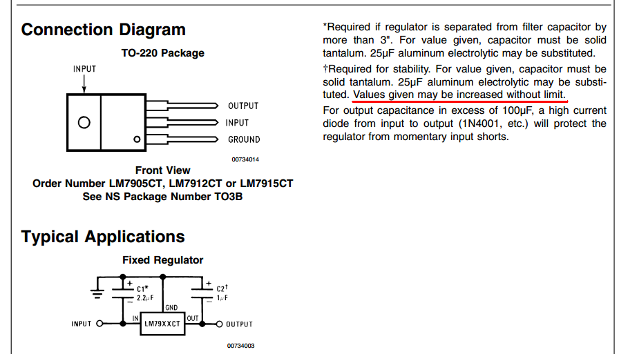 >Dankesehr, auf das hab ich beim Durchblicken des Datenblattes garnicht >geachtet... Hättest du es getan, dann wäre dir wahrscheinlich die Stelle aufgefallen, die ich dir im Anhang kopiert habe. Demnach benötigt der LM7915 zur Stabilität einen Cap am Ausgang, der größer ist als 100n! Rod Elliott wußte was er tat, als er dort eine Parallelkombination aus 100n und 100µF vorgesehen hat. Also, den Elko dort auf keinen Fall weglassen! Siehe auch die Diskussion hier: Beitrag "Re: geht 7812 auch ohne Cs gut?" Der LM7815 ist zwar deutlich gutmütiger als der LM7915 und braucht den Elko zur Stabilität nicht, doch auch er profitiert von einem zusätzlichen Elko am Ausgang. Deswegen hat Rod Elliott auch dort einen 100µF Elko plaziert.