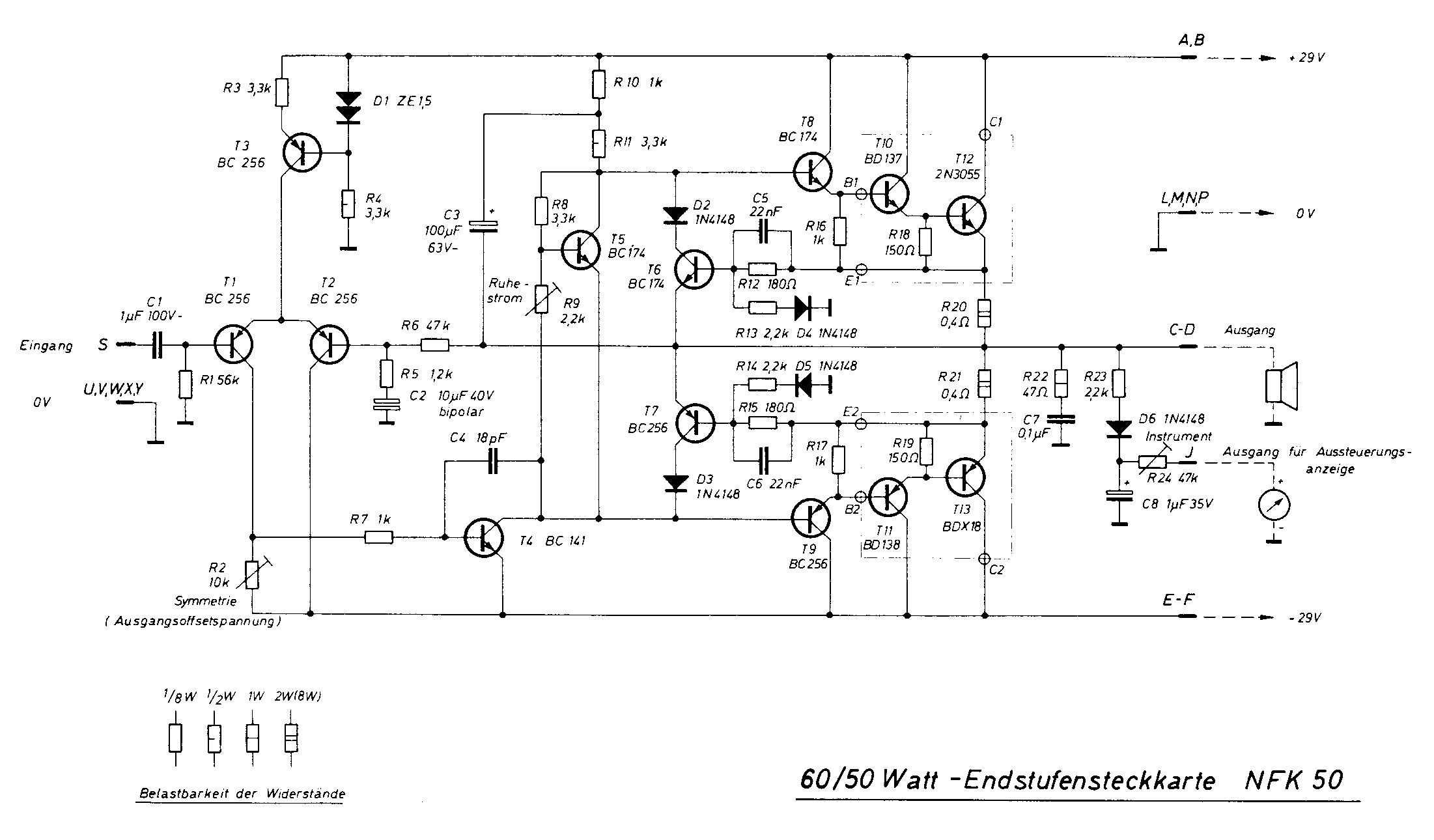 > ich möchte mal meinen Verstärkerschaltplan zur Diskussion stellen DEIN Verstärkerschaltplan ? Klingt ja nach deiner neuesten Erfindung. Dabei ist das die Grundschaltung eines bipolaren Verstärkers seit 50 Jahren. Siehe den angehängten 50W Verstärker von Radio RIM 1974 Grundschlatung, weil ihr noch alles fehlt was einen betriebssicheren verstärker auszeichnet, und die Bauteilauswahl keine besonders guten technischen Daten zulässt. Zu Z1 kommt oft noch ein Elko parallel. Auf jeden Fall brauchen die Ausgangstransistoren einen SOA Überstromschutz, damit nicht bei einem kurzen Kurzschluss am Ausgqang (Kabel zum Lautsprecher fallen zusammen) gleich der ganze Verstärker hops geht. Dann braucht man ein Relais zum Abtrennen des Ausgangs bei Fehlfunktion, welches auch als Anti-Plopp verwendet werden kann. Dann braucht man ein Netzteil und den Kühlkörper, beides mit Temperatursicherungen damit beide (wie bei kommerziellen Verstärkern üblich untersimensioniert) bei längerer Überlastung nicht kaputt gehen. Der Weg zu einem richtigen Verstärker ist von dieser Grundschaltung her also noch weit. http://www.dse-faq.elektronik-kompendium.de/dse-faq.htm#F.30