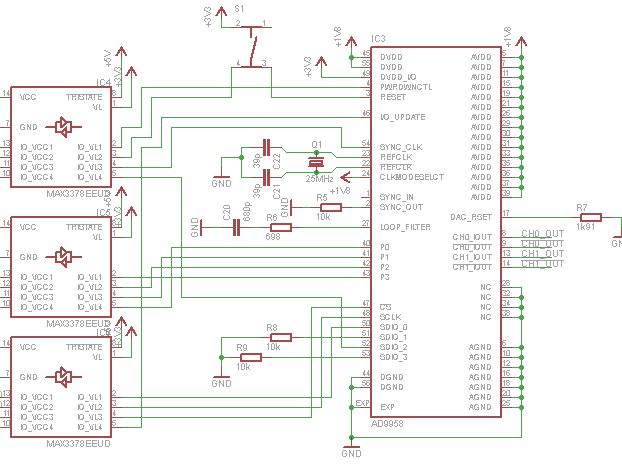 Hallo zusammen, fuer meine Forschungsarbeit an der Uni muss ich mich mit dem DDS-Baustein AD9958 auseinandersetzen. Dafuer habe ich bereits eine Platine nach dem Schaltplan des Eval-Boards erstellt. Diese Platine wird dabei auf ein Arduino Mega 2560 aufgesteckt und via SPI ueber Pegelwandler angesteuert. Grundsaetzlich funktioniert antwortet mit der DDS auch. Im channel select register CSR habe ich beide Channels eingeschaltet und auf 3-Wire SPI umgestellt. Auch habe ich im function register 1 FR1 die wichtigsten Einstellung eingetragen. Wenn ich diese Register auslese, bekomme ich die eingeschriebenen Werte auch wieder zurueck. Lediglich das Frequenz- und das Phasenoffsetregister nehmen die Werte nicht an. Dementsprechend kommt "hinten" am DDS auch nichts raus. Im Beitrag "DDS AD9958 - Probleme mit dem extrahieren des Chips" wurde dieses Problem schon einmal erwaehnt, aber nicht geloest. Mein Code hat folgende Struktur: CSR (0xF2) schreiben (CH0 & CH1 aktiviert, 3-Wire SPI, MSB) FR1 (0xD054A0) schreiben ((PLLx20>255MHz,CP 75µA, 2-lvl modulation + RU/RD, SYNC_CLK disable) Freq schreiben (Phase schreiben) IO_Update Anschliessend lese ich (wegen debugging) alle Register wieder aus. Ich hoffe, einer von euch kann mir da helfen. Gruss Roman