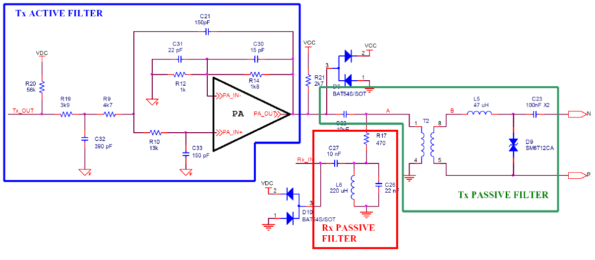 Das ganze ist die Ausgangsbeschaltung des Powerline IC ST7540. Woran soll man sich eigentlich halten, wenn Beschaltungen im Datenblatt anders sind als in Application Notes zu dem Baustein?