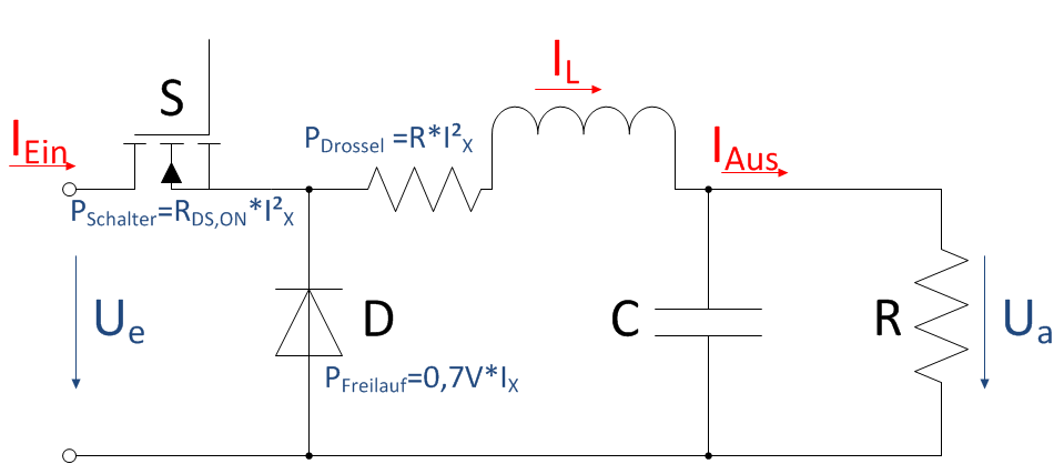 Hallo Miteinander, ich möchte die Durchlassverluste eines Abwärtswandlers bestimmen. In dem im Anhang beigefügten Bild sind die drei Bauteile(Drossel=L+R) in denen Durchlassverluste auftreten gezeigt. Mir stellt sich die Frage, welchen Strom (Eingangs oder Ausgangsseitig) ich nehmen muss, um die Verluste zu berechnen. Habt ihr eine Idee? mfg DerFrieden