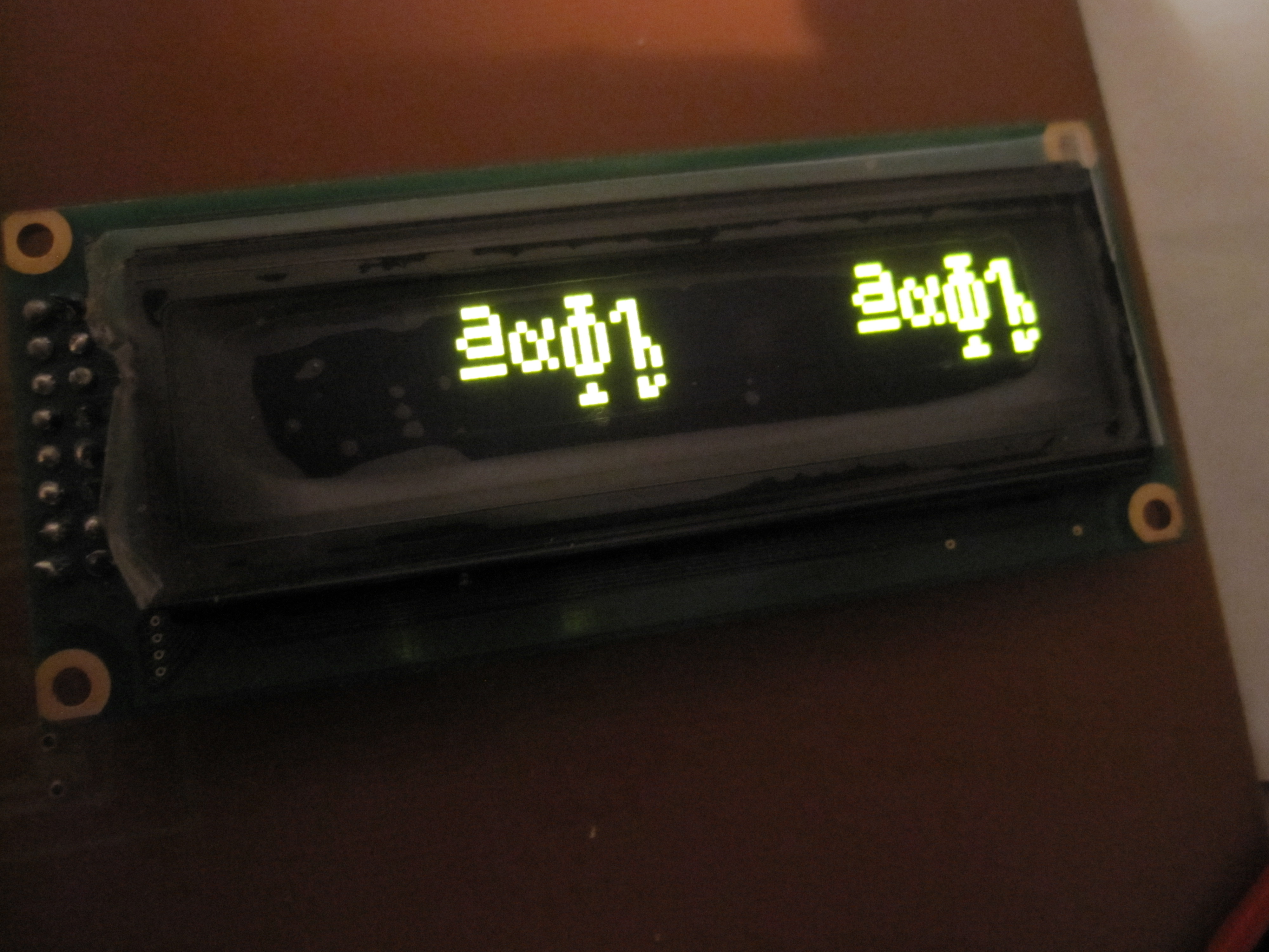Hallo zusammen, ich möchte ein OLED-Display von Fa. Reichelt bzw. Electronic Assembly mit HD44780 ähnlichem Controller zum Laufen bringen. Hier das Datenblatt: http://www.lcd-module.de/fileadmin/pdf/doma/oled.pdf. Die Ansteuerung soll über einen PIC16F627A Controller erfolgen. Als Ergebnis werden aber seltsame Zeichen ausgegeben, allerdings reproduzierbar und aus dem richtigen Zeichensatz. Nur eigentlich sollte was anderes angezeigt werden... ("Hallo Welt"). Ein Foto habe ich angehängt. Es treten auch andere komische Effekte auf (siehe Kommentare im Code)... Vielleicht kann mir jemand helfen - den kompletten Code habe ich beigefügt. Mir gehen langsam die Ideen aus ;-( Grüße Olaf