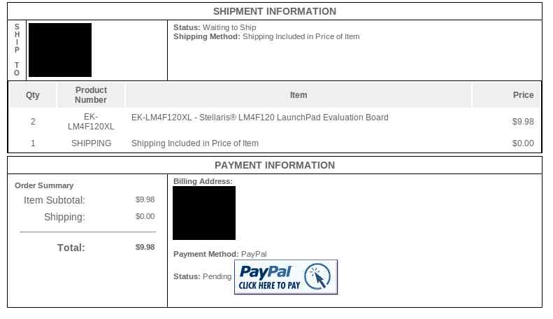 Moin zusammen, ich möchte mir von Texas Instruments das Stellaris Board für $4.99 bestellen. http://www.ti.com/ww/en/launchpad_site/stellaris.html?DCMP=stellaris-launchpad&HQS=stellaris-launchpad-b Bei Ausfüllen der Bestellformulare werde ich nach einem Company Name und dessen Website gefragt. Hat jemand schon Privatkäufe in dem Ti eStore getätigt? Paypal Zahlung soll ja ja TI nach möglich sein. "We are happy to accept PayPal on all eStore purchase" Viele Grüße und danke im vorraus! Marcello
