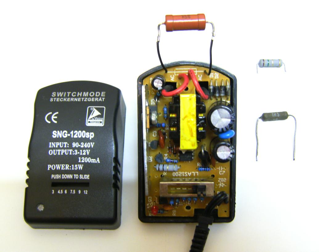 Guten Morgen Leute, seit gestern bin ich etwas schlauer, was den Defekt eines Stecker-SNT angeht, aber wiederum irritiert, wieso es nun plötzlich anders sein soll. Im Eingangskreis auf der Netzseite war noch vor der Gleichrichtung ein 3-Watt R mit 1,5 Ohm platziert. Das Stecker-SNT lag länger ungenutzt herum, muß man wohl dazu auch noch erwähnen. Nun braucht man das mal für exotische Spannungen 7,5 V, und dann raucht das Ding einfach ab. Wohlgemerkt ohne Belastung oder Nutzung. Also zerlegt und gesucht, nichts gefunden was nach zerschmort aussah, dann mal über dem betreffenden fetten R gemessen, und siehe da Fehler gefunden. Ausgelötet und neuen 2-Watt.Typen, weil kein gr. vorhanden, wieder rein. Eingeschalten und so ein kleines leises Geräusch sagte mir, das wars als nächstes dann wieder. Kontroll-LED ging gar nicht erst an. Also Suche geht weiter, mit den müden Glotzen (Augen) und ohne Lupe, aber seht selbst > Bilder! Nur Nichts gefunden, also Trick 17 > Meßgerät in den Kreis eingeschleift, hat aber auch Nichts gebracht, SNT läuft nicht an, I angebl. 4,7 mA ~ ! Dann mit dem Prüfzeug der Fehlerfindung > Duspol mit LEDs eingeschleift, und SNT läuft, offensichtlich, die Kontroll-LED am Ausgang leuchtet jedenfalls. Ja was nun? Wieder versucht die Stromaufnahme in dem Kreis zu messen, aber war ja klar, wurde wieder nichts, bei 4,7 mA ~ angezeigter I-Stärke. Über Umwege dann den Strom durch das Eli-Werkzeug ermittelt (gemessen / geschätzt) > U-Abfall darüber konnte man ja noch am Delinqenten ermitteln, daraus resultierende R-Wert errechnet, im Lager gesucht, Oldtimer russ. Herkunft gefunden > freu <, eingelötet (siehe Bild) und funktioniert. Eins macht mich jetzt aber sehr stutzig, es sind statt 1,5 Ohm 2,2 Kohm geworden, und die Größe des R´s ist auch eher 5 Watt. Nur wird der recht warm wenn man das Teil (SNT) ordentl. belastet. Jetzt die finale Frage, da stimmt doch so einiges absolut nicht mehr, nur was?