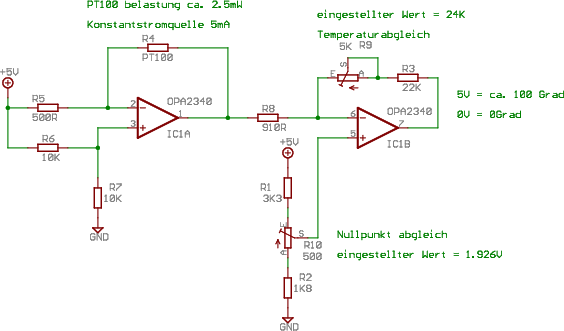 Bei solchen von bellenden Dilletanten zusammengepfuschten Schaltungen wird mir speiübel. Bau sowas lieber überhaupt nicht nach, sondern lies erstmal ein bissel im Internet bei Leuten, die was von der Sache verstehen. Dir ist hoffentlich klar, daß die "gemessene" Temperatur direkt von der Höhe der Versorgungsspannung abhängt. Obendrein brät diese Schaltung den PT100. Du solltest nicht mehr als etwa 1 mA dem guten Stück zumuten. Jajaja, ich weiß, daß damit die Spannung über dem PT100 nicht groß ist. Was kommt bei dir denn nach dem zweiten OpV? ein Multimeter? oder was? W.S.