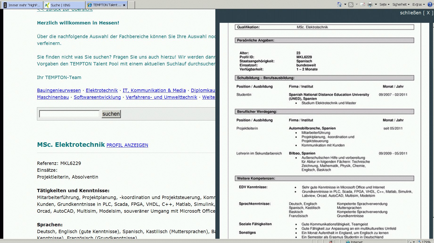 der Liste der Sprachkenntnisse abliest: Deutsch, Englisch, Französisch,