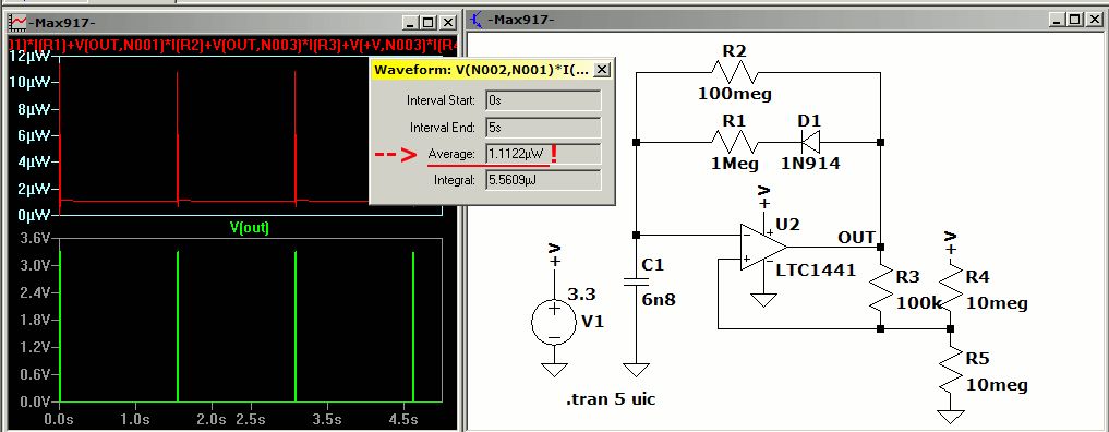 Krangel schrieb: > Die Verlustleistung über allen > Widerständen liegt bei 1.1µW, der Komparator braucht nochmal das > Gleiche. Der Komparator dürfte um 6,3µW Ruheleistung verbraten. Hast du den in deiner Sim nicht berücksichtigt?