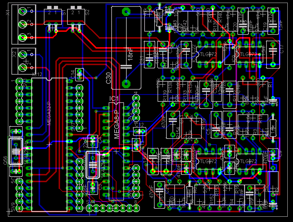 Übel, übel, Deine Platine: a.) Keine Abblockkondensatoren an den Controllern. b.) Quarze von den Controllern einen halben Kilometer entfernt. c.) Versorgungsspannungsleitungen viel zu dünn. d.) Kein Masse-Konzept. e.) Rückkoplungsnetzwerke an Deinen OPV viel zu weit entfernt. f.) Signalleitungen unter den Quarzen. g.) Analog- und Digitalteil nicht räumlich getrennt. Das ist ja noch schlimmer als ein Steckboard-Aufbau. Wenn das Teil halbwegs reproduzierbar funktioniert, grenzt das an ein Wunder. Vielleicht bekommst Du ja von den 10 Bit der Analog-Digitalwandler unterm Strich noch etwa 6 Bit raus, mehr wird es wohl nicht werden, der Rest ist Rauschen und Störungen... Also, kurz zusammengafasst, in harten Worten: Dieses "Layout" ist Schrott und Pfusch.